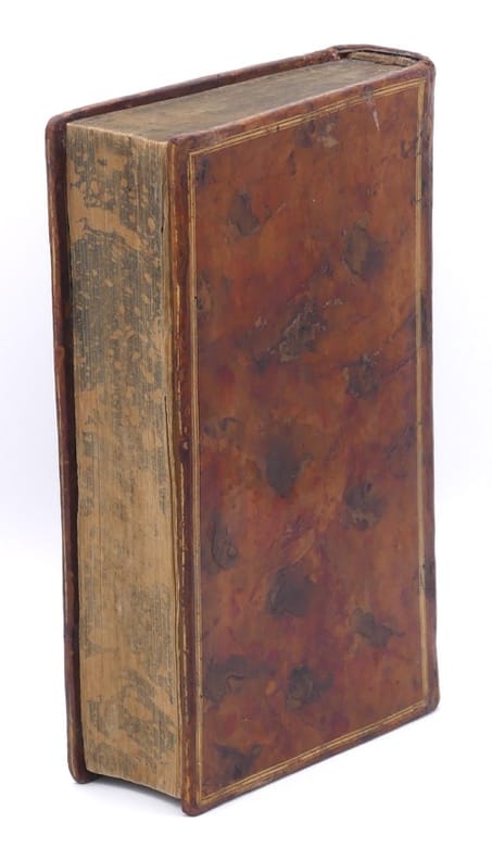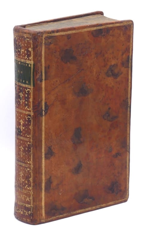Paris, Théophile Barrois, 1788. In-8 (197 x 122 mm), XVI pp., 582 pp., 5 ff. n. ch. Veau fauve et porphyre tacheté, triple filet doré encadrant les plats, dos lisse orné, pièce de titre en veau vert, filet doré sur les coupes, tranches marbrées à l'imitation des gardes, coiffes et coins restaurés, petit trou dans la marge en gouttière p. 440 à 456, déchirure réparée sans manque à une planche et au Plan de la Palomière, déchirure de 2 cm à ce dernier sans manque, taches jaunes à 3 planches (reliure de l'époque).