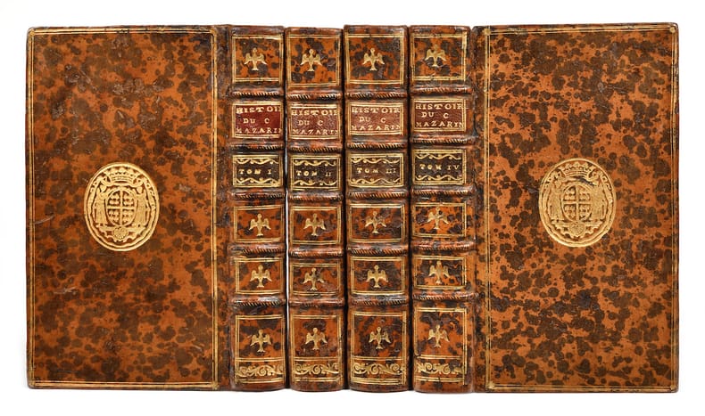 Cet ouvrage fut publié pour la première fois en 1671, puis réimprimé plusieurs fois avant cette édition, en 1681, 1688, 1695 et 1718.Cette histoire biographique parut dix ans après la mort du prélat. Diplomate et homme politique français d'origine italienne, le cardinal Mazarin (Pescina, 1602-Vincennes, 1661) fut d'abord au service de la papauté, avant de servir les rois de France Louis XIII et Louis XIV. Il succéda à Richelieu en tant que principal ministre d'État de 1643 à 1661.Avocat au Parlement de Paris, Antoine Aubéry (Paris, 1616-1695) fut l'un des écrivains et apologistes officiels de la cour de France au XVIIe siècle. Très érudit, il consacra l’essentiel de ses travaux à l’histoire de France et de ses grands serviteurs.L'exemplaire de Montmorency-Fosseux.Fils unique d'Anne-Léon Ier, baron de Montmorency, Anne-Léon II de Montmorency (Paris, 1731-Münster, 1799), marquis de Fosseux, puis duc de Montmorency, fit une carrière militaire. Il fut d'abord menin du Dauphin puis capitaine-lieutenant des gendarmes de la reine en 1745, participa au siège de Maastricht en avril 1748, prit part à de nombreuses batailles, fut fait chevalier de Saint-Louis en 1758 puis fut promu brigadier de cavalerie en 1761 et maréchal de camp en 1763. Il émigra à Münster lors de la Révolution et mourut dans cette ville le 1er septembre 1799. Ex-libris armorié de de La Rochefoucauld, duc de Bisaccia. Ex-libris moderne illustré de Gilles Cheyrouze.Bel exemplaire en reliure de l'époque armoriée.Graesse, I, p. 248. OHR, pl. n° 810, fer n° 2.