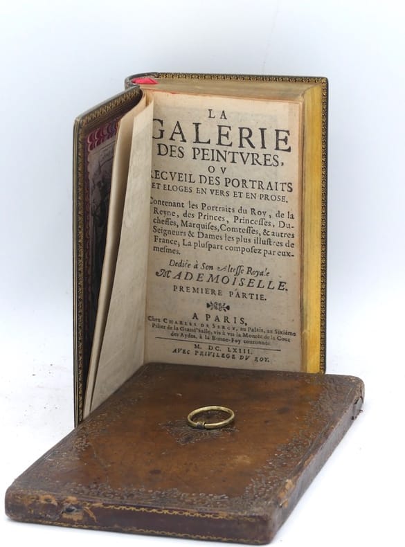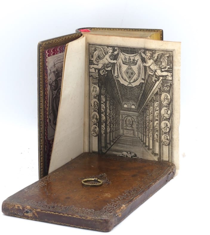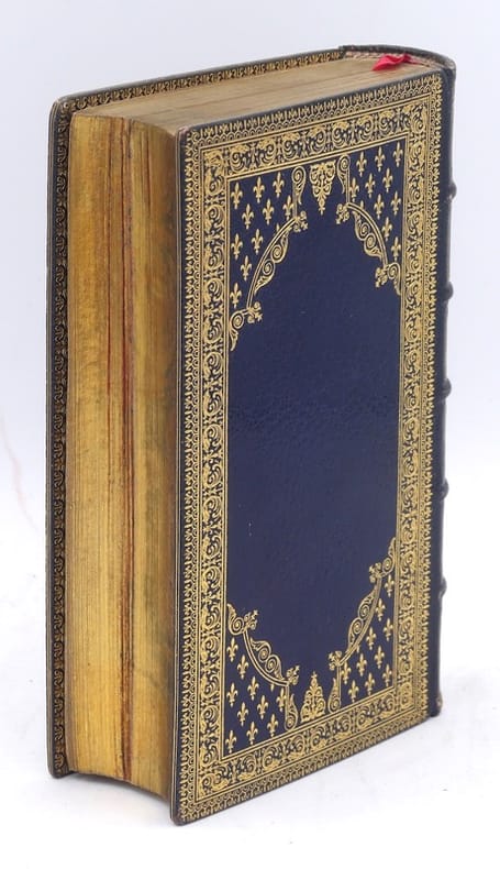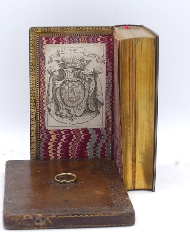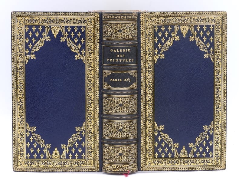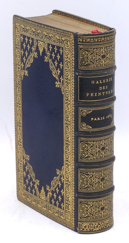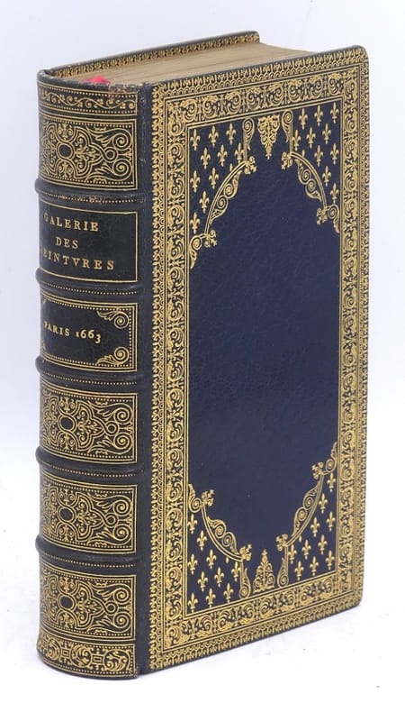 Paris, Charles de Sercy, 1663. Deux parties en un volume in-12 (151 x 94 mm), 18 ff. n. ch., 336 pp. ; 4 ff. n. ch., pp. 337 à 779. Maroquin bleu marine, large encadrement des plats par une double frise dorée, décor en écoinçons avec semis fleurs de lys et fers dorés, dos à nerfs richement orné de jeux d'arabesques et filets dorés, titre, lieu et date dorés, double filet doré sur les coupes, frise et roulettes dorées sur les chasses, signet de soie rouge, tranches dorées sur marbrure, dos légèrement assombri (Duru 1851).