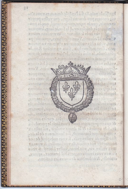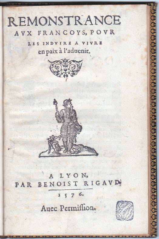 Une édition originale très rare. Cette plaquette a été composée à l’occasion de la tenue des Etats Généraux de 1576, dans l’esprit d’apaisement qui fut celui de Duplessis-Mornay. L'exemplaire de l'historien du protestantisme Ernest Stroehlin. Docteur en théologie et professeur d'histoire de la religion à l'Université de Genève, Gaspard-Ernest Stroehlin (1844-1907) posséda une riche bibliothèque, axée principalement sur le protestantisme. Son ex-libris à la devise "Mente libera" (d'un esprit libre) est illustré d'une représentation de Calvin enseignant la théologie en la cathédrale Saint-Pierre de Genève, représentée derrière lui. Sa bibliothèque fut vendue en trois parties de 1910 à 1912. Tampon ex-libris non identifié sur le titre. Bel exemplaire en maroquin de Petit-Simier. Baudrier, III, 40 n° 2 ; S.H.F., Hauser, 2283.3.