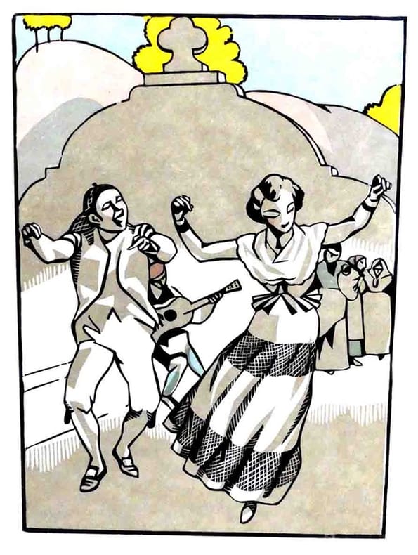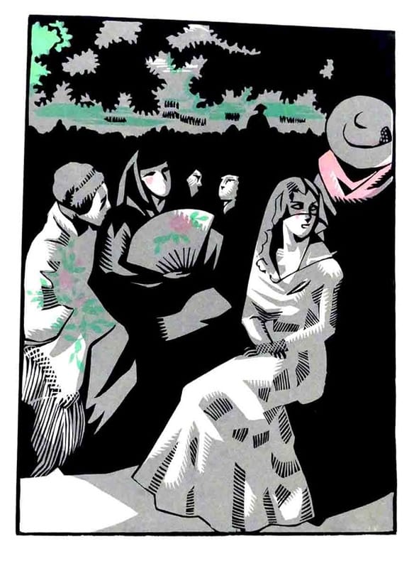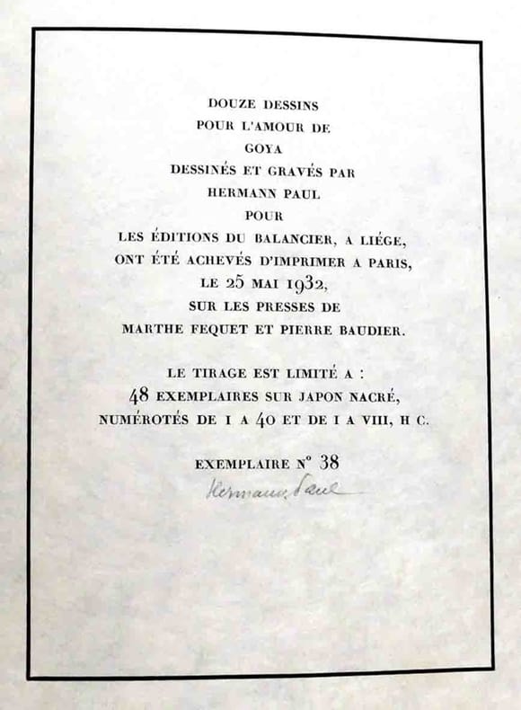Cette très rare suite en couleurs a été dessinée et gravée sur bois par Hermann-Paul. La vie de Goya. Cette suite en couleurs a été dessinée et gravée sur bois par Hermann-Paul. Elle représente en 12 moments de la vie de Goya : sa jeunesse, ses études de peintre, sa vie à Madrid, à la cour, à Bordeaux… Chaque planche est précédée d'un titre pris dans un encadrement. Elles ont été tirées à Paris sur les presses de Marthe Fequet et de Pierre Baudier. Hermann-Paul (Paris 1864-1940), peintre, professeur à l'école des beaux-arts de Paris, graveur et illustrateur est surtout connu pour son œuvre de dessinateur humoristique. Il participa notamment à L'Assiette au beurre, La Vie parisienne, Le Rire… Son œuvre picturale s'inspire de celle de Cézanne dont il admirait l'œuvre et des Nabis avec qui il exposa au Salon d'automne. Hermann-Paul est l'auteur de nombreuses suites comme La Vie de monsieur Quelconque (1894), Conseils obscurs (1925). Il illustra Carmen de Mérimée (1927), Gargantua de Rabelais (1921), Le Testament de Villon (1922), L'Assomoir de Zola (1920)… Cette rare suite, inconnue à Monod, a été imprimée à seulement 48 exemplaires sur Japon nacré. Celui-ci est l'un des 40 (n°38) signé par l'artiste. Très bel exemplaire.