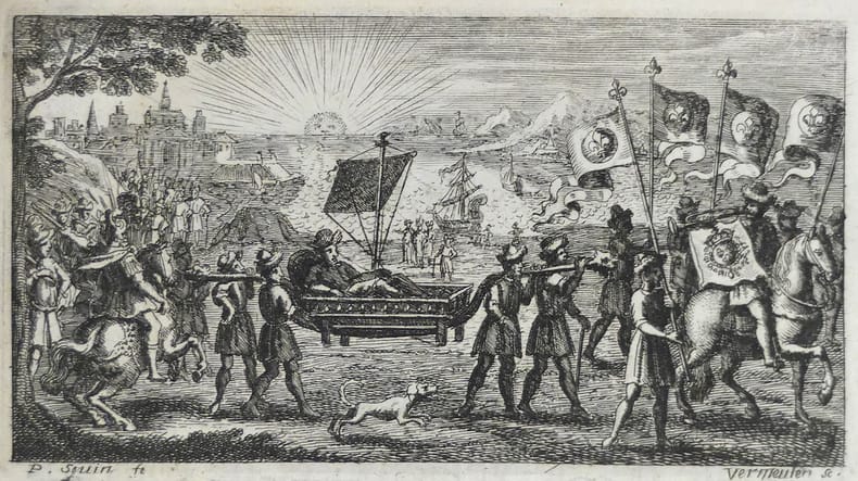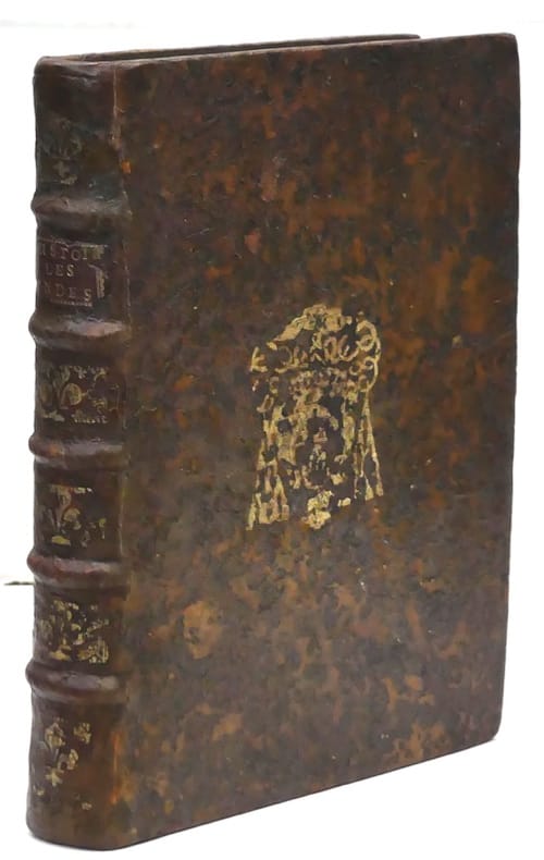à Paris, chez Jean Desaint & Charles Saillant 1744 3 volumes. In-16 17 x 9,5 cm. Reliures de l’époque veau havane marbré, dos à nerfs encadrés de fers dorés, [18]-396-353-471-[7] pp., bandeaux, lettrines, 1-1 cartes repliées, table en fin de chaque volume. Coiffes avec accroc, coins de pied émoussés et frottés, intérieur frais.