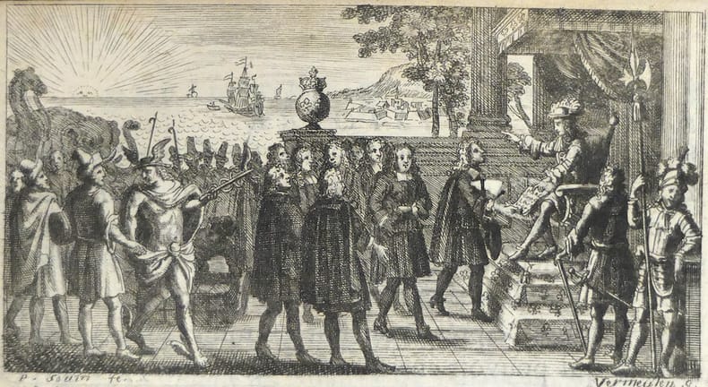 Édition originale de cet "ouvrage recherché" (Chadenat). Administrateur colonial, Urbain Souchu de Rennefort (1630-1690) fut officiellement délégué en 1665 par la Compagnie française des Indes orientales pour prendre possession de l’île de Madagascar. Il publia successivement en 1668 et 1688 deux ouvrages sur son voyage dans le sud-ouest de l’océan indien. Cet ouvrage, "traitant presque entièrement de Madagascar" (Chadenat), relate le long voyage en mer et les péripéties de la découverte de l’île par l’auteur. Il y donne des renseignements sur les affaires, le développement de la Compagnie et livre ses réflexions sur l’installation des Français à Madagascar. Parti de Brest, il relate les étapes du voyage le long de l’Afrique - du Sénégal au Cap de Bonne-Espérance - jusqu’à son arrivée sur l’île où il fut très mal accueilli par les chefs de la Colonie. De retour en France, il est capturé par les Anglais et emprisonné à Londres. L'édition est ornée d’une vignette de titre et de trois en-têtes historiés gravés par Vermeulen d’après Sevin. Ex-libris armorié du XIXe siècle d’un marquis. Cachet bleu "E. de St-Basile". Exemplaire en reliure d'époque armoriée. Bibliothèque de feu M. Ch. Chadenat, II, n°7180. Boucher de la Richarderie, Bibliothèque universelle des voyages, V, pp. 20-21.