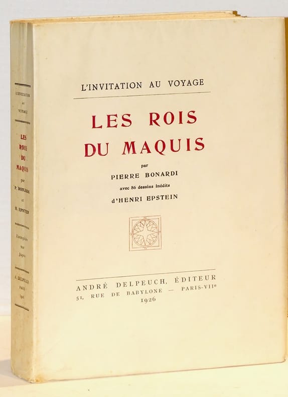 Edition originale, un des 10 sur Japon (n°9) d'un tirage à 116 exemplaires. L'ouvrage est illustré de 86 dessins inédits hors-texte et in-texte de Henri Epstein. L'édition courante ne comporte que 74 dessins de l'artiste et se trouve en petit in-8. Comme le précise l'auteur dans la préface, après avoir commis depuis des années un roman, de longues études et des articles passionnés sur la Corse, l'auteur, parce qu'il est insulaire, craint toujours de n'avoir pas suffisamment préparé le lecteur continental à entendre des récits qui paraissent d'un autre âge… C'est un texte documentaire et critique, à rapprocher de textes objectifs, à proprement parler de reportages. Bon exemplaire de tête de ce reportage dans le maquis Corse. Monod, I, p. 250, 1677.