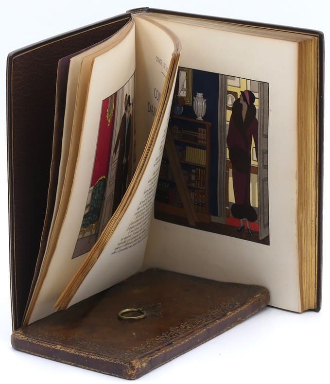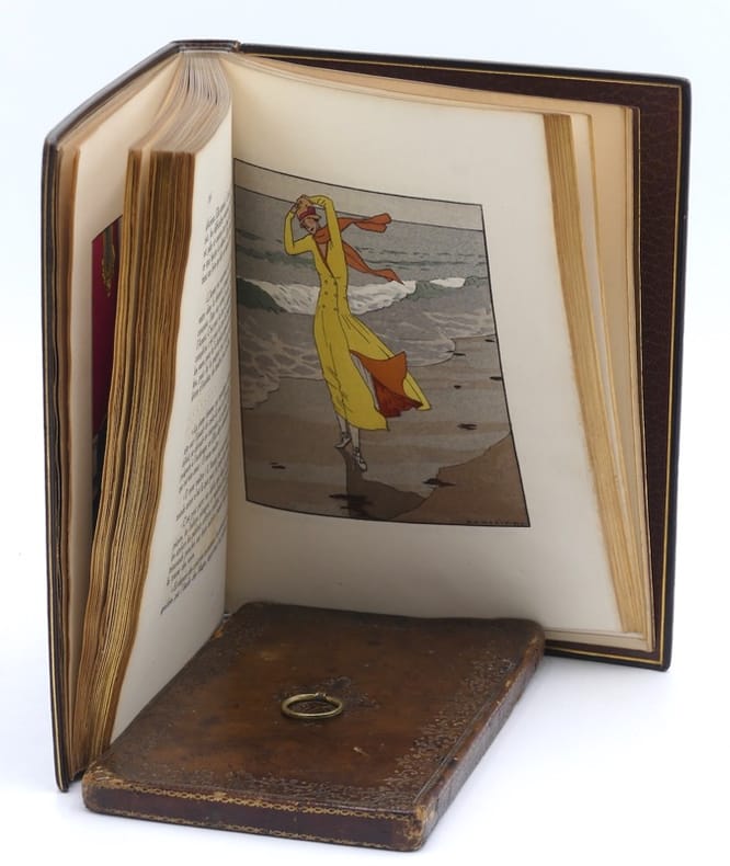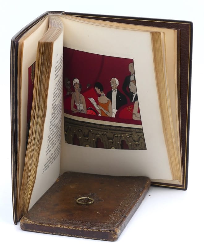 Le premier livre illustré par Marty. Le roman de François de Bondy est orné de 12 aquarelles de Marty reproduites par le maitre-imprimeur Frazier-Soye, et coloriées au pochoir par ses soins au 168, Boulevard du Montparnasse à Paris. Un des 250 exemplaires sur vélin d'Arches (n°153). Le charme mondain des années folles. André-Édouard Marty (Paris 1882-1974), graveur et illustrateur français, dessina des décors et des costumes pour le Théâtre des Arts ou pour la Comédie Française. Il fut membre du jury à l'Exposition des Arts décoratifs de 1925 et contribua ainsi à l'essor d'un art qui tranche avec le classicisme. Le style de Marty allie à la fois élégance et rigueur, et fait la part belle aux aplats de couleurs. Les aquarelles qui agrémentent cette édition sont particulièrement délicates autant par leur coloris que par les effets de transparences, la finesse du dessin. Marty est par ailleurs très sensible à la mode de ces années d'après-guerre dont il pare les femmes, et aux atmosphères qu'il traduit par de chauds effets d'ombre et de lumières. Parfait exemplaire en maroquin doublé de Dubois d'Enghien-Dooms.
