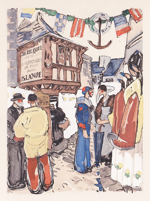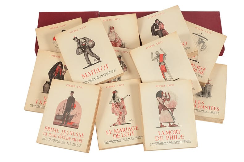 “Édition recherchée et cotée” (Carteret). Portrait-frontispice de loti, gravé au burin par Gandon, et 400 illustrations en couleurs, fac-simile, coloriées au pochoir, dont 118 hors-texte, par divers artistes réputés. Un des 20 exemplaires de tête sur Japon, celui-ci n°10, contenant les illustrations hors texte en couleurs en trois états, état couleur, état bistre et état noir. Contrairement à ce qu'indique Carteret, nous n'avons trouvé aucun exemplaire sur Hollande ou Japon comportant des dessins originaux. L'ensemble comprend : Aziyadé illustré par Leroux, Les Désenchantées par Calbet, Madame Chrysanthème par Sylvain Sauvage, Le Mariage de Loti par Domergue, Matelot par Fouqueray, Mon frère Yves par Dufour, La Mort de Philae par Deluermoz, Pêcheur d'Islande par Méheut, Prime jeunesse par Marty, Ramuntcho par Brissaud, Le Roman d'un enfant par Marty, Le Roman d'un spahi par Fouqueray, La Troisième jeunesse de Madame Prune par Sauvage, Un Pélerin d'Angkor par Lalau et Vers Ispahan par Deluermoz. Bel exemplaire. Carteret, Le Trésor du bibliophile, livres illustrés modernes 1875-1945, IV, p. 247.