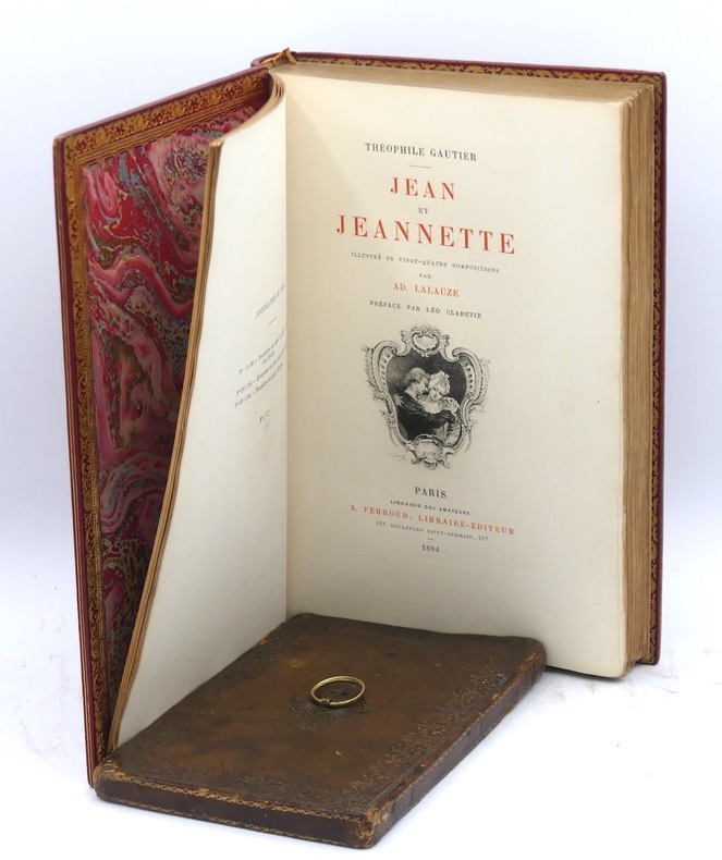 Édition illustrée de 24 fines compositions dessinées et gravées à l'eau-forte par Adolphe Lalauze : 12 têtes-de-chapitre, 12 culs-de-lampe et une vignette au titre reprise en couverture. Tirage limité à 500 exemplaires, CELUI-CI sur PAPIER du JAPON avec 3 ÉTATS des EAUX-FORTES : eaux-fortes pures ; eaux-fortes terminées avant la lettre avec remarques ; eaux-fortes avec la lettre, et une composition originale, AQUARELLE de LALAUZE, Exemplaire numéroté et paraphé par l'éditeur, le n° 33 auquel a été AJOUTÉ un PORTRAIT de GAUTIER.Charmante publication, cotée en grand papier, précise Carteret. Superbe maroquin doublé de Mercier (1855-1910), successeur de Cuzin. Après avoir présenté une exposition remarquable au Cercle de la Librairie, Emile Mercier participa aux expositions de Paris en 1900, d'Hanoï en 1903, de Saint-Louis en 1904, où,à chaque fois, il obtint les plus hautes récompenses. Il était président de la Chambre syndicale de la reliure depuis 1901. (Fléty, pp. 126-127, et planches). "Jean et Jeannette est un témoignage éclatant de cet amour de Gautier pour le XVIIIe siècle qui ne s'est jamais démenti. Il s'y livre à une véritable transposition d'art : l'oeuvre est jalonnée de tableaux inspirés de Boucher, de Fragonard ou de Lancret, restituant, dans la langue du temps, l'atmosphère des boudoirs, des fêtes galantes et des pastorales, avec leur raffinement, leur douceur, leur sensualité et leur esprit. Le roman tient du rêve et ressemble à un conte. Mme de Champrosé et le vicomte de Candale vont essayer, à l'aide de déguisement, de partir à la recherche de leur essence en changeant d'apparence, d'échapper à l'artifice par l'artifice. Tout en s'abandonnant à l'humour, parfois à la verve caricaturale, Gautier y exprime, en empruntant la plume de Marivaux, sa quête de l'amour et du bonheur, aspirations profondes qui donnent à ses deux aimables protagonistes plus de consistance qu'il n'y paraît, puisque sous le masque transparaissent des traits humains." (P. Laubriet, notice du roman, "Pléiade", t. II) Carteret, Livres illustrés modernes IV, 178 - Monod, Manuel de l'amateur de livres illustrés modernes, 5191 - Fléty, Dictionnaire des relieurs français...