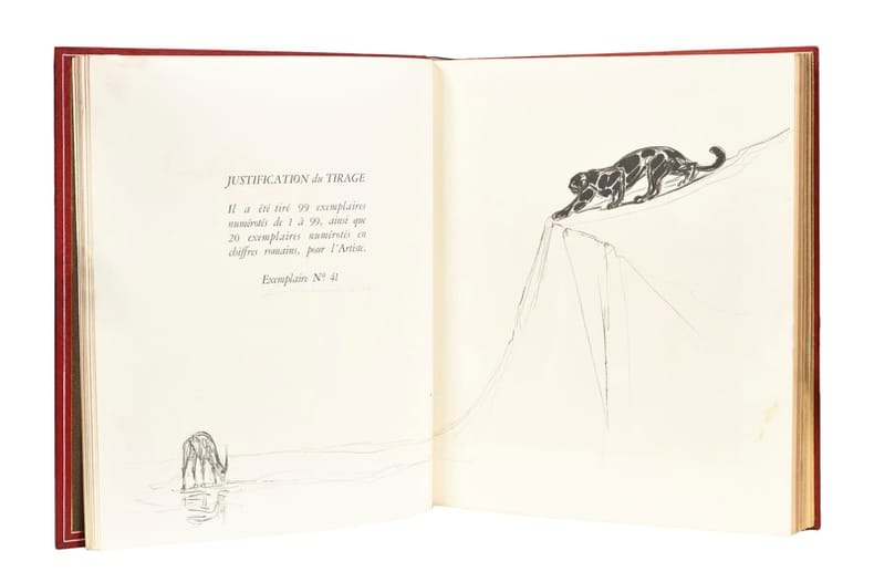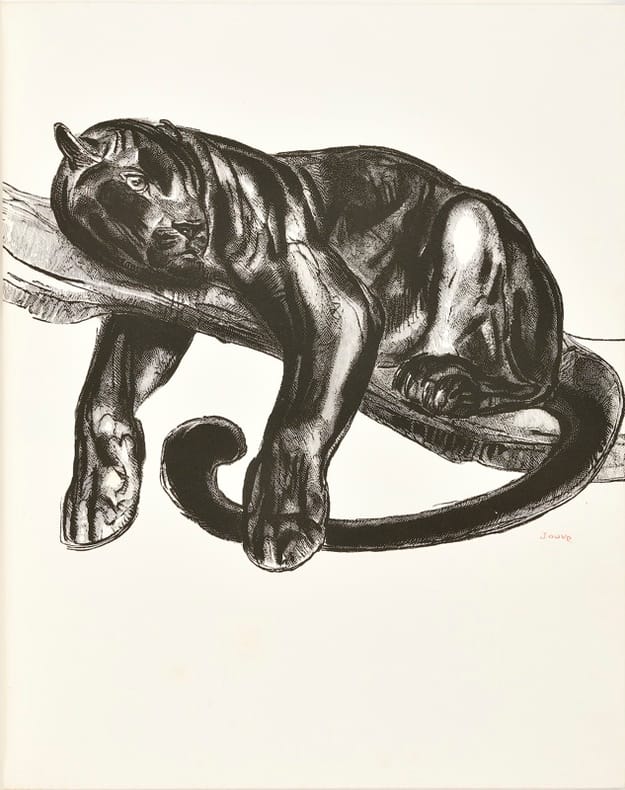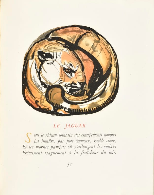Edition illustrée de 30 compositions originales de Paul Jouve gravées sur bois par J.-L. Perrichon, la plupart en couleurs, dont un frontispice, une vignette de titre, deux double-pages, huit à pleine page et dix-huit dans le texte. Tirage unique à 119 exemplaires sur vélin d’Arches, dont 20 pour l’artiste. Exemplaire comportant une suite en noir sur Japon impérial, une suite de quelques états non terminés, une suite d'essais d'eaux-fortes en couleurs sur Japon nacré et une suite avec justificatifs de ces essais d'eaux-fortes. "Publication estimée et très cotée" (Carteret). Remarquable rencontre entre une sélection des poèmes de Leconte de Lisle mettant en scène des animaux sauvages et l'un des meilleurs peintres animaliers français. Le recueil de Leconte de Lisle parut en 1862 et renferme certains de ses poèmes les plus mémorables dont Le Jaguar. Paul Jouve (1878-1973) peintre et sculpteur, se spécialisa dans l’art animalier. Membre de l'Académie des Beaux-Arts, il fut un des maîtres de la période Art Déco. Ex-libris gravé H. Lebaudy. Elégante reliure à décor d’oiseaux d’Alain Devauchelle. Carteret IV, 236. Félix Marcilhac, Paul Jouve, p. 379.