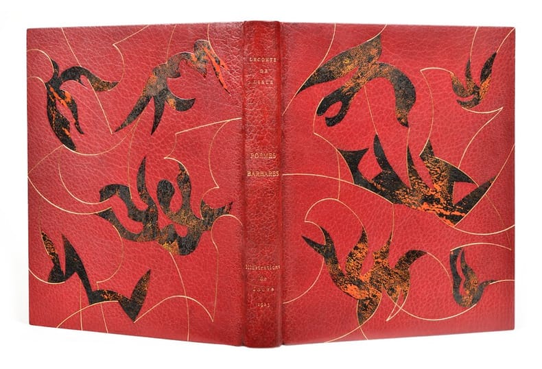 Lausanne, Gonin, 1929-1931. Grand in-4 (301 x 238 mm), 50 pp., 9 pp. n. ch. Maroquin framboise, large décor d’oiseaux au pochoir sur fond noir avec filets dorés sur les plats, tranches dorées, étui (Devauchelle).