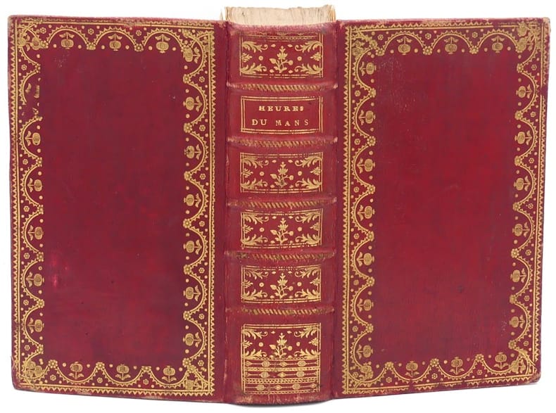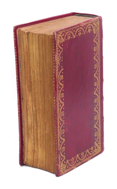 Fougères, J. M. Vannier, 1791. In-12 (103 x 167 mm),1 f. bl., 9 ff. n. ch., 876 pp., IV pp. Maroquin rouge, large encadrement de filet, fers à la tulipe et fleurons, dos à nerfs orné, fers sur les coupes et les coiffes, tranches dorées (reliure de l’époque).