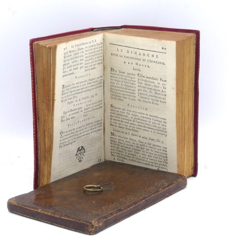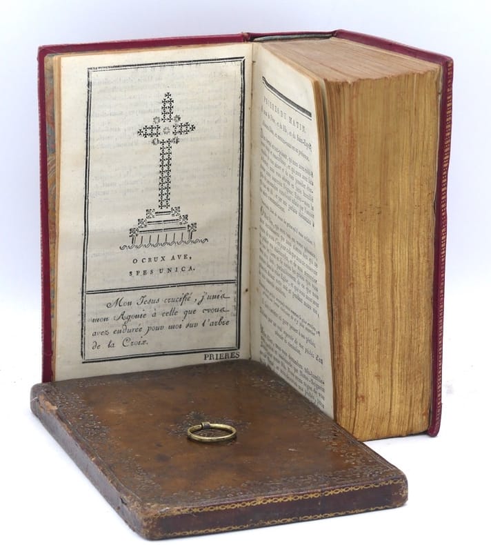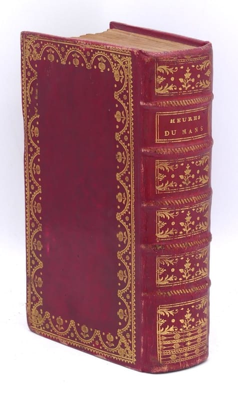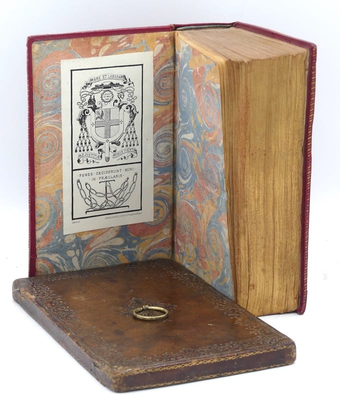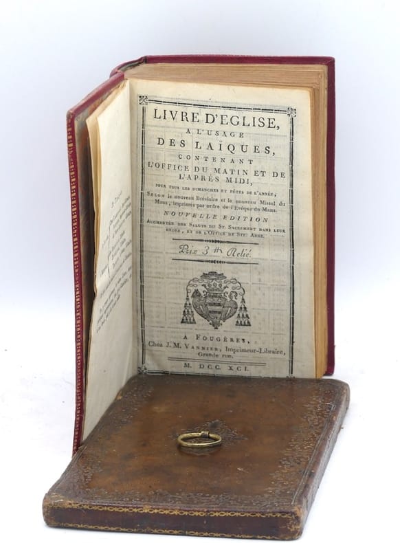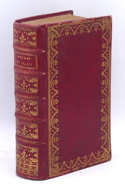 Un livre d’Église destiné aux paroissiens de la Mayenne. Un feuillet en regard du frontispice indique les 3 principaux libraires de Laval et de Mayenne où l’on pouvait acheter ce missel ainsi que l’annonce : Et chez tous les autres libraires du Diocèse. Ce livre d’Église à l’usage des laïques fut imprimé à Fougères selon le nouveau Bréviaire et le nouveau Missel du Mans. Il indique, en latin et en français, les prières à réciter toute l’année en fonction du calendrier. Il contient également une table de fêtes mobiles allant de 1791 à 1826. Ex-libris moderne gravé aux armes d’un prélat. Très bel exemplaire en maroquin d’époque.