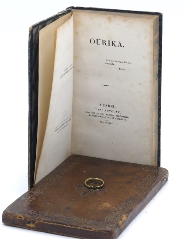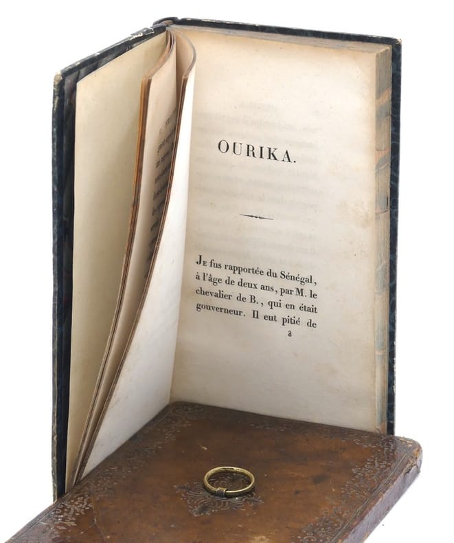 Première édition mise dans le commerce. L'édition originale, publiée la même année, ne fut tirée qu'à 40 exemplaires par l'Imprimerie royale. Une deuxième édition parut encore la même année chez Ladvocat. Elle en porte la mention. Ces trois première éditions parurent sans nom d'auteur. Ce premier roman de la duchesse de Duras (Brest, 1779-Nice, 1828), qui fut immédiatement un best-seller, relate l'amour malheureux d'une jeune sénégalaise pour le petit-fils d'une famille aristocratique qui l'avait recueillie et élevée. L'originalité du sujet pour l'époque et la délicatesse de ton firent d'Ourika un des romans les plus célèbres parus sous la Restauration. Très bon exemplaire en reliure de l'époque. Barbier, Dictionnaire des ouvrages anonymes, III, p. 754. Carteret, Le Trésor du bibliophile romantique et moderne 1801-1875, I, p. 250. Vicaire, Manuel de l'amateur de livres du XIXe siècle, III, p. 535.