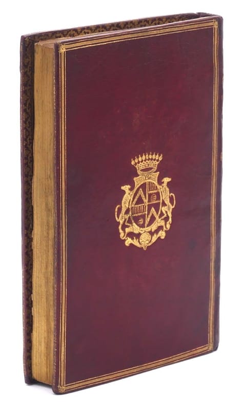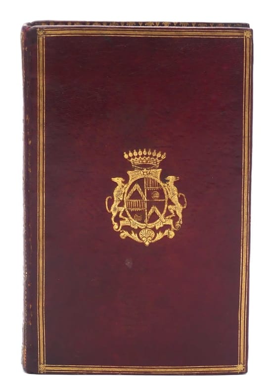 Paris, Didot, 1786. In-12 (118 x 187 mm), 32 pp., 190 pp., 1 f. n. ch., inversion de pages entre les pp. 48 et 65. Maroquin rouge aux armes, filet d'encadrement, dos lisse orné, roulette sur les coupes, filet sur les coiffes, roulette intérieure, tranches dorées, gardes de tabis bleu, légère mouillure en marge supérieure, restaurations aux coiffes (reliure de l'époque).