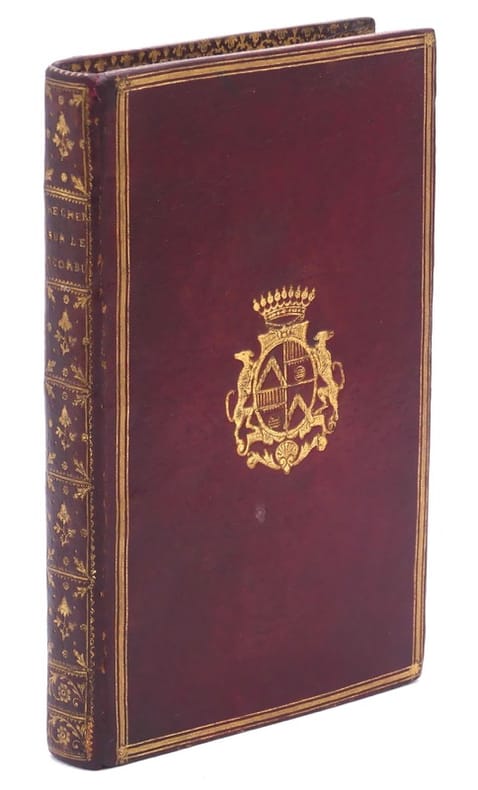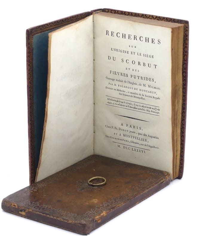 L'exemplaire du traducteur. Cet ouvrage fut publié la première fois en anglais en 1782. Il a été traduit par Barthélémy Vigarous de Montagut, docteur en médecine et membre de la société des sciences de Montpellier. C'est comme lithomiste qu'il acquit sa réputation, puis dans le traitement des maladies vénériennes. Il est notamment l'auteur d'ouvrages sur la régénération des os. Première édition française de cette importante étude sur le scorbut. Francis Milman, médecin de la Société royale des sciences de Londres, eut la chance d'être l'un des deux médecins-voyageurs du docteur Radeliffe. Ce dernier avait laissé un legs pour l'avancement de la médecine et le bien de l'humanité à l'université d'Oxford. La rente de 600 Livres sterling était destinée aux frais de deux jeunes médecins pendant dix années de voyages dont au moins cinq à l'étranger. L'ouvrage donne notamment la méthode employée par le capitaine Cook pour garantir ses équipages de l'attaque du scorbut. On y trouve de nombreux exemples concrets tirés de différents récits de voyages maritimes ou terrestres. Bel exemplaire en maroquin aux armes de Vigarous de Montagut. Bayle & Thillaye, Bibliographie médicale, II, 501-502.