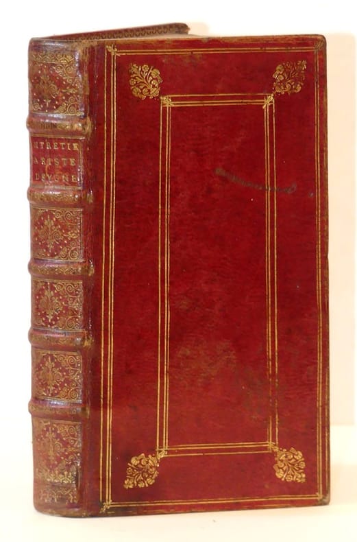 La quatrième édition, mais la première contenant les mots des devises expliqués. Elle est illustrée d'un frontispice gravé par Chauveau. Dom Bouhours 1628-1702) savant jésuite est l'auteur de nombreux ouvrages, il a participé à une traduction du Nouveau testament et est Édition rare en joli maroquin du temps. Barbier d'Aucourt a publié une excellente critique de cet ouvrage intitulée Sentiments de Cléante sur les Entrtiens d'Ariste et d'Eugénie [Supercheries, I, 752, b]. Barbier, II, p. 125.