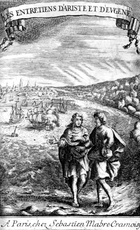 Ecrit se livrant à la critique de l’ouvrage du Père Bouhours Entretiens d’Ariste et d’Eugène et de l’ouvrage de l’Abbé de Villars De la Délicatesse qui prit sa défense, sur l’art de bien parler et le “bel esprit”. Brunet , 18634. Annotations manuscrites sur la page de titre.