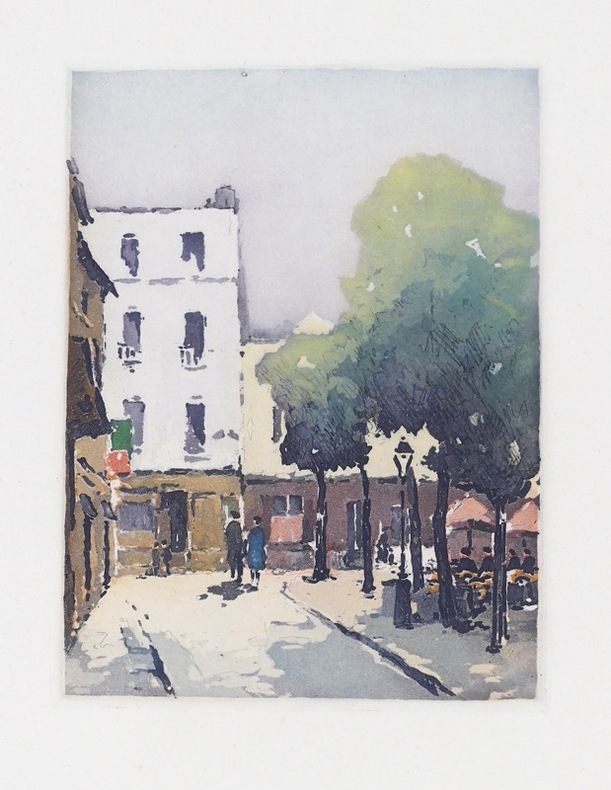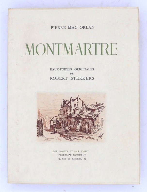 Le vieux Montmartre illustré. L’illustration comprend 13 eaux-fortes originales hors-texte en couleurs de Robert Sterkers. Elles figurent les rues et les monuments du quartier de Montmartre où Pierre Mac Orlan vécut. Le premier volume de la collection Par Monts et par Vaux. Le graveur Robert Sterkers illustra le premier volume de la collection de L’Estampe moderne consacrée à Paris, son histoire et ses quartiers. L’édition fut tirée à 525 exemplaires, celui-ci sur papier Arches. Bel exemplaire.