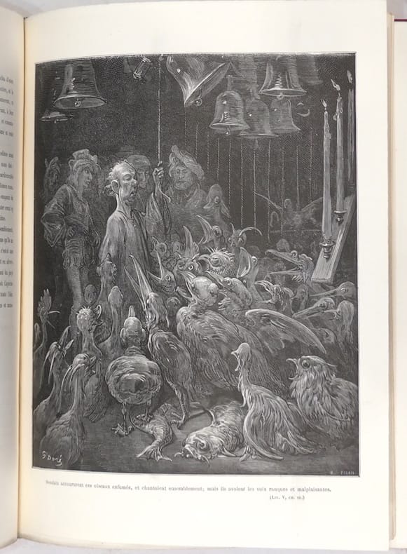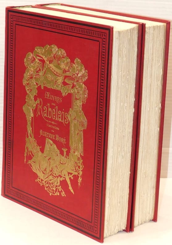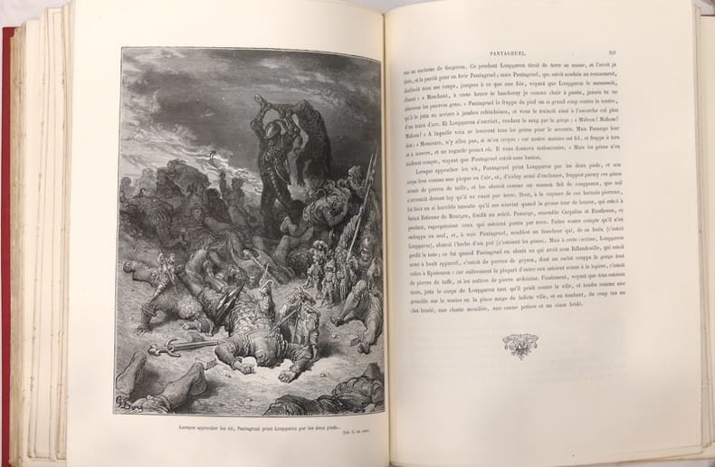 Un des chefs d’œuvre de Gustave Doré. Il s’agit du second tirage de l’édition donnée par Garnier en 1873, un des plus beaux livres de Gustave Doré. L’illustration comprend un portrait de Rabelais en frontispice, 59 planches hors texte et plus de 600 têtes de chapitres, culs-de-lampe et vignettes dans le texte gravés sur bois. Une petite centaine de dessins sont extraits de l’édition de Bry, 1854, et quelques vignettes proviennent des Contes drolatiques. Gustave Doré «voulut refaire sa curieuse et fantastique évocation du Moyen-âge dans un champ plus vaste. Il eut recours aux in-folios, si lourds à manier, mais qui réunissent pourtant beaucoup de qualités. On trouve dans ceux-ci une suite incomparable de magnifiques dessins, dont un certain nombre nous vient de l’édition Bry, et une typographie qui ne laisse rien à désirer» (Leblanc). Le texte, collationné sur les éditions originales, est accompagné d’une vie de l’auteur, de notes et d’un glossaire par Louis Moland. Très bel exemplaire, parfaitement conservé dans sa percaline décorée. Leblanc, Catalogue de l’œuvre de Gustave Doré, II, p. 292. Carteret, III, p. 511 (pour le premier tirage de 1873).