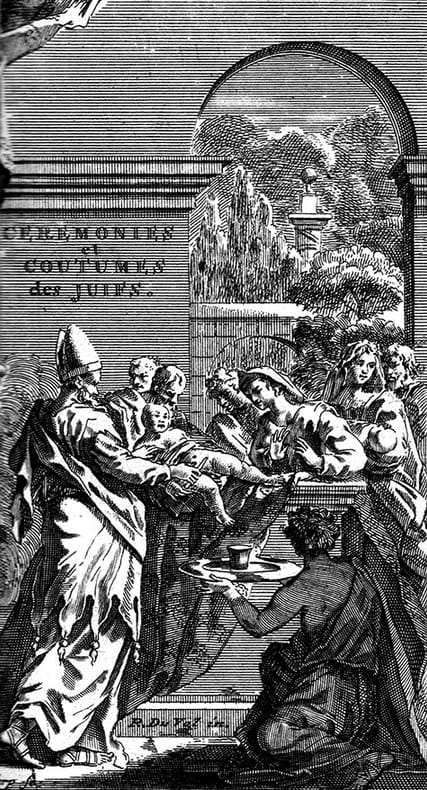 Troisième édition revue, corrigée et augmentée d'une seconde partie qui a pour titre, «Comparaison des Cérémonies des Juifs, & de la discipline de l'Eglise». L’édition est illustrée d’un beau titre-frontispice figurant une scène de circoncision gravée d’après Du Val. L’ouvrage, source de première importance pour la connaissance du judaïsme européen, a été traduit de l’italien du rabbin vénitien Léon de Modène par le célèbre bibliste et hébraïsant Richard Simon (ou Simonville) (Dieppe, 1638 – 1712). L'oeuvre est en effet principalement celle de Richard Simon lui-même, et contient le supplément sur les sectes juives hérétiques, les Caraïtes et les Samaritains, ainsi que plusieurs autres chapitres sur les divinations et sortilèges. Selon Caillet, «cette traduction française est des plus recherchées à cause de Richard Simon». Important et peu courant judaïca, précédé d’une préface à Bossuet. Bel exemplaire en maroquin rouge. Caillet, n°6539. Quérard, La France littéraire, III, 349. Fléty, p. 138.