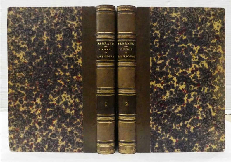 Antoine Ferrand (1751-1825), historien, homme d’état, membre de l’Académie française (1816) et de la Chambre des pairs, fut un des grands écrivains de la contre-révolution avec Bonald. Ils sont d’ailleurs réunis par Béranger dans quatre vers de “La Sainte Alliance barbaresque”: Ces rois par leur Sainte Alliance, Nous forçant à l’obéissance, Veulent qu’on lise l’Alcoran, et le Bonald et le Ferrand. L’Esprit de l’histoire valut à l’auteur les compliments les plus empressés de l’empereur de Russie et fut très en vogue sous la Restauration. L’ouvrage eut de multiples éditions. Bel exemplaire en demi-veau glacé de Trautz-Bauzonnet.