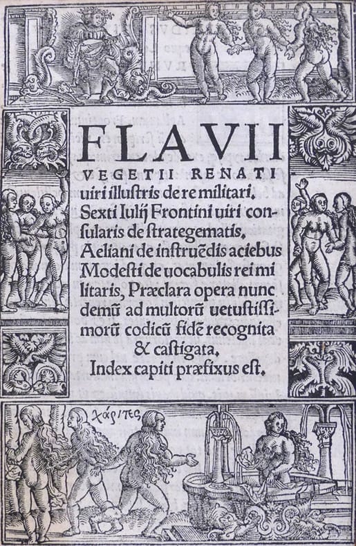 Le plus important traité militaire de l'Antiquité. L'ouvrage de Végèce sur l'art militaire, écrit à la fin du IVe siècle, est une compilation de textes antiques. Il est, depuis le Moyen-âge, la source officielle de ceux qui veulent écrire sur la guerre. On y traite de tous les aspects de la guerre et de sa préparation: recrutement et sélection des recrues, organisation militaire, discipline, logistique, hygiène aux armées, tactique, moral, logistique, génie, artillerie, guerre navale… Les sources du traité de Végèce sont romaines, car il les déclare supérieures aux grecques que le sort des armes a sanctionnées. Celse, Frontin, Caton, les constitutions militaires d’Auguste, Trajan et Hadrien sont évoqués par l’auteur, en plus de divers historiens comme Salluste. L'importance de ce texte fait de Végèce le premier auteur militaire ancien à être imprimé; c'est aussi le plus publié aux XVe et XVIe siècles. À la fin du XIVe et au début du XVe siècle, la plupart des éditions de ce traité sont couplées à d'autres textes anciens d'art militaire: ceux de Frontin, Élien et Modestus (cet auteur n'a en réalité jamais existé et le texte n'est qu'une reprise de Végèce ; la supercherie date de la fin du XVe siècle). Ce corpus est souvent désigné sous l'appellation de Veteres scriptores de re militari. Cette édition en latin fut la première allemande à rassembler tous ces textes. Elle fut établie par Gottfried Hittorp, auteur de l'avant-propos, et publiée à Cologne par Johannes Soter. Les textes furent précédés d'une table des chapitres et d'un index. Cette édition fut reprise en 1532 à Cologne par Eucharius Cervicor. Cet exemplaire ne contient que le texte de Végèce. Les textes de Frontin et d'Elien furent séparés au XVIIIe siècle à la reliure. La table qui précède fut aussi retranchées de l'index des deux textes absents. Bel exemplaire en maroquin du XVIIIe siècle.