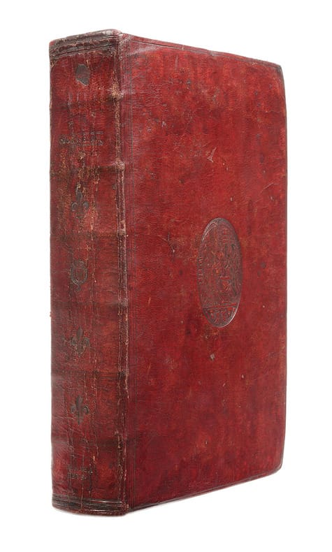 Cologne, Maternus Cholinus, 1572-1573. 3 tomes en un volume in-folio (318 x 197 mm), 18 ff. n. ch., 207 pp. ; 631 pp. ; 2 ff. n. ch., 311 pp.Maroquin rouge, plaque ovale au centre des plats figurant la présentation du Christ au temple, filet à froid encadrant les plats, dos lisse orné d’un fer macabre en tête, du blason aux armes royales, de grosses fleurs de lys répétées et de la devise “Spes mea Deus” en queue, le tout estampé à froid, tranches argentées, traces de décor argenté sur les médaillons, quelques épidermures, petite mouillure au début du volume, des cahiers uniformément brunis, soulignements anciens aux pp. 62-63 du tome 3 (reliure de l’époque).