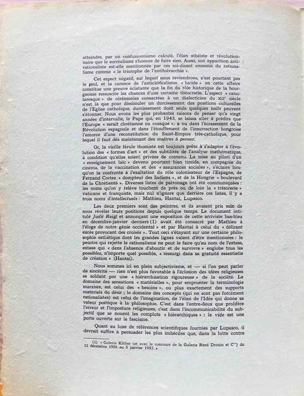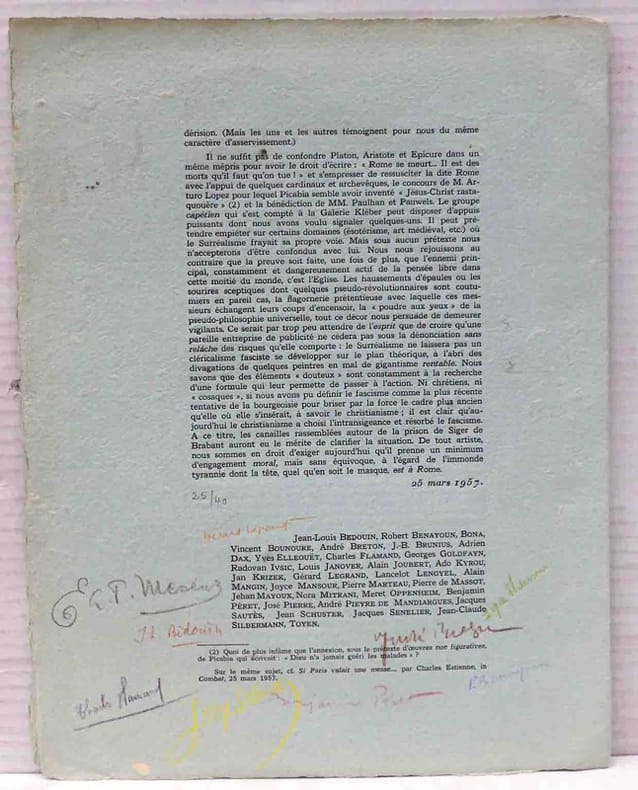 Paris. 25 mars 1957. Double feuillet 32,5 x 25,5 cm. Impression en noir sur papier d'Auvergne Richard de Bas. Long tract contre les tendances religieuses et réactionnaires de G. Mathieu et S. Hantaï (anciennement surréaliste) en réaction à l'exposition de la Galerie Kléber. Tract signé par J.-L. Bédouin, Bénayoun, Breton, R. Ivsic, Toyen, J. Mansour, J. Schuster, B. Péret, P. de Massot, etc. E.O. 1/40 ex. num. portant les signatures autographes en couleurs de E.L.T. Mesens, G. Legrand, B. Péret, A. Breton, J. Mansour, Ch. Flamand, J.-L. Bédouin, R. Benayoun, J. Schuster.