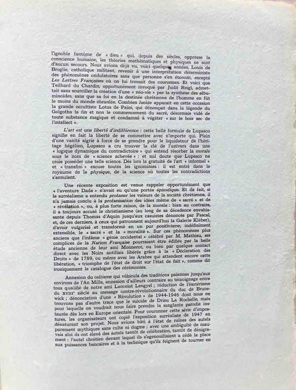 Edition originale. Un des 40 exemplaires justifié à la mine de plomb sur papier d'Auvergne Richard de Bas (celui-ci n°2). Long tract contre les tendances religieuses et réactionnaires de G. Mathieu et S. Hantaï (anciennement surréaliste) en réaction à l'exposition de la Galerie Kléber. Avec les signatures autographes de différentes couleurs de 8 des 33 signataires : Gérard Legrand, Jean-Louis Bédouin, Charles Flamand, Jean Schuster, Benjamin Péret, André Breton, Robert Benayoun, Joyce Mansour. Édouard Léon Théodore Messens non signataire du tract a toutefois signé.En parfaite condition.