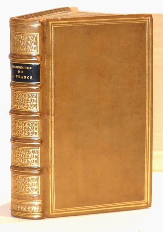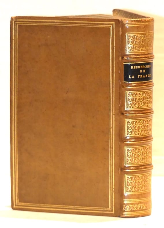 PREMIÈRE ÉDITION POSTHUME, reprenant celle de 1611, qui était la première édition complète. Elle contient un BEAU PORTRAIT de l'auteur gravé par Thomas de LEU (1560-1612). Les "Recherches de la France" constituent une première tentative d'histoire scientifique, débarrassée du carcan des références mythiques ou théologiques. OUVRAGE PRÉCIEUX, tant pour l'histoire, que pour l'histoire des institutions de France, la linguistique et l'étymologie. (Brunet, IV, 407). «Ni synthèse, ni reconstitution chronologique, l'ouvrage est une somme de points de détail et de réflexions personnelles à l'instar des "Essais" - un prototype en quelque sorte, car le premier Livre des "Recherches" parut dès 1560. Évocation de telle figure historique, analyse de tel dicton, origine de telle coutume, histoire de la Pléiade et des combats pour la langue française, etc. Avec, en toile de fond, une préoccupation quasi obsessionnelle ; la réhabilitation des "anciennetez" gauloises, la défense et l'illustration de la langue et des traditions nationales. [...] Oeuvre surgie d'une époque de crise nationale aiguë [...], les "Recherches" entendent réconcilier un peuple avec son terroir, la nation avec le sol qui l'a formée. Entreprise réaliste, s'il en fut, où l'école positiviste du siècle dernier s'est reconnue » (Fr. Lestringant). AGRÉABLE EXEMPLAIRE conservé dans sa reliure d'époque. GOOD COPY. PICTURES AND MORE DETAILS ON REQUEST.