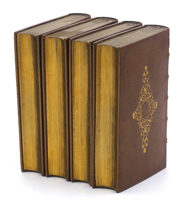 Paris, Werdet et Lequien fils, 1829. 4 volumes in-12 (123 x 77 mm). Maroquin havane, décor composé d'un médaillon encadré de rinceaux et de fleurs, dos à nerfs orné, double filet sur les coupes et les coiffes, roulette intérieure, tranches dorées sur marbrure (Hardy).