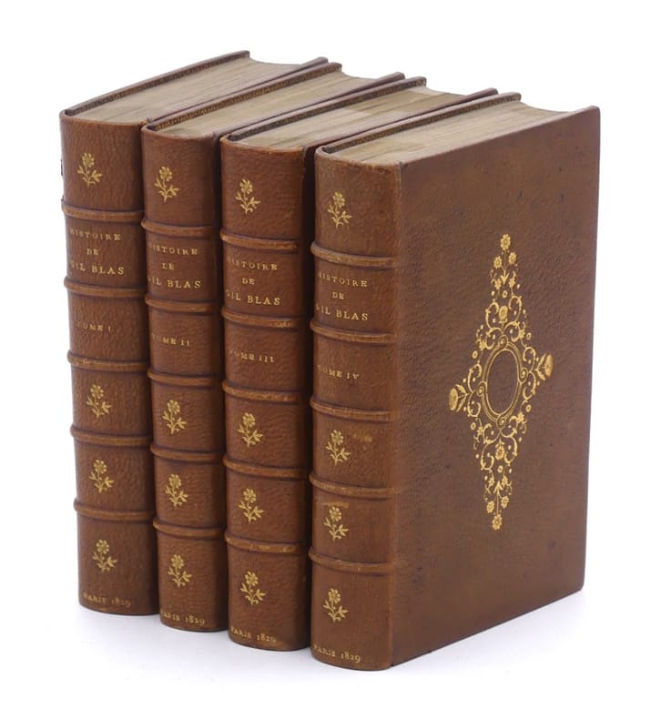 Cette édition est précédée d'une notice historique et littéraire de M. Patin. Elle fait partie de la "Collection des meilleurs romans françois, dédiée aux dames", publiée entre 1825 et 1829. L'ouvrage est illustré de quatre frontispices et de quatre vignettes de titre gravés sur acier d'après Desenne. Les frontispices sont en trois états (dont deux sur Chine montés avant la lettre), ainsi que les vignettes de titre (dont un état sur Chine monté avant la lettre et un état sur Chine monté avec la lettre). Cet exemplaire, imprimé sur papier bleu, est enrichi d'une suite de 88 vignettes hors texte gravées sur bois et montées sur Chine. Vicaire ne signale pas ce tirage en bleu ni cette suite. Très bel exemplaire en maroquin de Hardy. Vicaire, Manuel de l'amateur de livres du XIXe siècle, II, p. 791.