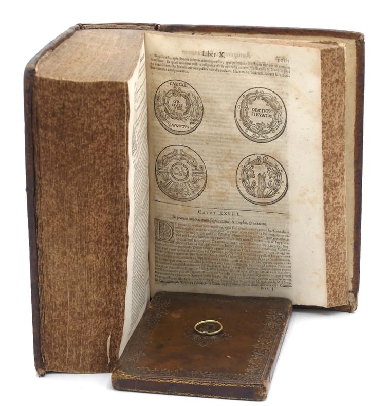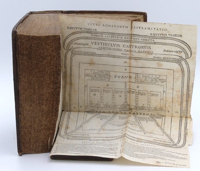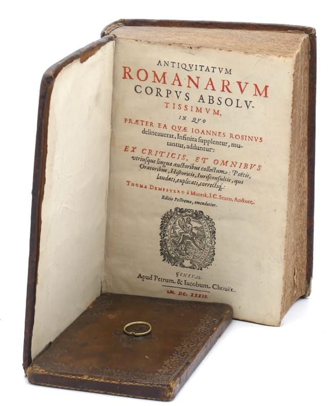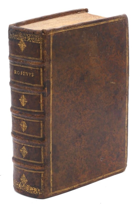 " Trajecti ad Rhenum (Utrecht), Apud Guilielmum vande Water, 1701, thick in-4°, 24 x 19 cm, (xii) + 956 + (30) pp, index, with 7 engr. plates (by P. Philippe), cont. vellum, ties missing, smooth spine, gilt supralibros with coat of arms on front and back cover. The text is sometimes in 2 columns, printed in roman and italic with occasional Greek quotations The engrav. half-title bears the inscription; ""Romanarum antiquitatum corpus absolutissimum cum notis doctissimis Thomae Dempsteri I.C. et oeneis figuris accuratissimis."" Johann Roszfeld, 1551- 1626, a Lutheran preacher from Saxony. This first compilation of Roman ""antiquities"" (religion, law, literature, customs) was first published at Basel in 1583; Thomas Dempster, 1579 - 1625, a Scots historian and humanist, publ. an expanded edition (Paris, 1613). Bound in at the end (with continous pagination) ; Pauli Manutii Antiquitatum Romanorum Libri Duo, de Legibus ed de Senatu...studio And. Schotti."