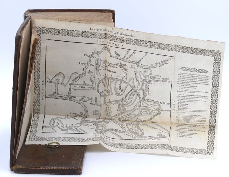 Gemäss Graesse die letzte Ausgabe dieses Handbuches zu altrömischen Denkwürdigkeiten, das seit 1583 mehrmals aufgelegt wurde. Die kartuschierten Tafeln zeigen verschiedene Münzen, lithurgische Gefässe bzw. religiöse Insignien sowie eine Begräbnis- und eine Festmahlszene, beide begleitet von Abbildungen der Gladiatorkämpfe. Es fehlt der gefalt. Stadtplan, der das antike Rom unter Septimus Severus darstellt. Orig. h-vellum binding, spine with serious loss, (to be restored), with the engraved allegoric front and 7 engravings, not present is the townmap from Rome antique. Except of this all a fine untrimmed copy, boards with 18 th century marbled paper. Graesse VI/166; Brunet IV/1398.