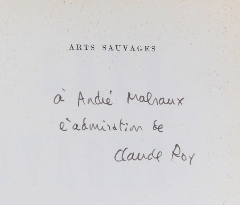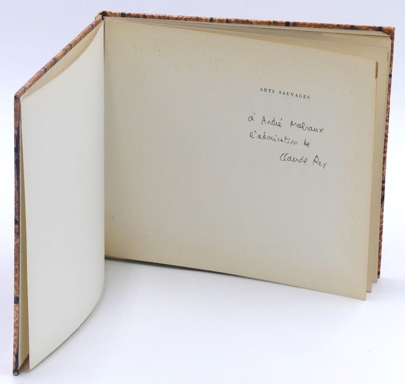 Édition originale dédiée à Tristan Tzara. La couverture est illustrée d'un tapa océanien. L'ouvrage reproduit également des objets d'art africain. Charles Ratton fut conseiller artistique du volume. L'exemplaire d'André Malraux. Cet ouvrage porte un envoi d'admiration de l'auteur à Malraux. Bel exemplaire.