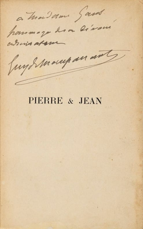 Édition originale précédée de la célèbre préface où Maupassant expose ses idées sur le sujet. Envoi signé de l'auteur “à Madame Sand hommage d'un dévoué admirateur”. George Sand étant décédée en 1876, l'envoi est soit adressé à la fille de George Sand, Solange, soit à sa belle-fille, l’épouse de Maurice Sand.