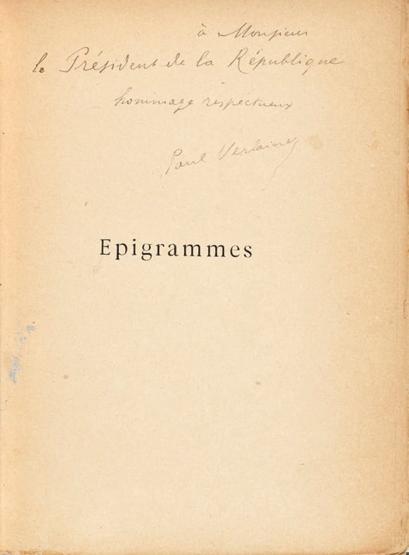 Édition originale. Ce recueil de trente vers qui a été écrit en juin 1894, alors qu'il était à l'hôpital Saint-Louis. Le titre du recueil est pris au sens qu sens qu'il eut en France jusqu'au XVIIe siècle : une courte pièce de vers sur un sujet quelconque. Verlaine déclare : “Cet opuscule fut écrit par un malade qui voulait se distraire et ne pas trop ennuyer ses contemporains. En conséquence la postérité est priée de n'y voir qu'un jeu.” Effectivement, c'est un jeu. Verlaine s'amuse, et cette fraîcheur de sentiments se moque heureusement de la grosse poésie parnassienne. Envoi de Verlaine au président de la République Jean Casimir-Périer. “À Monsieur le Président de la République. Hommages respectueux. Paul Verlaine”. Jean Casimir-Perier, né le 8novembre1847 à Paris et mort le 11mars1907 dans la même ville, fut élu à l’âge de 46 ans. Il est le deuxième plus jeune jamais élu à cette fonction, toutes républiques confondues, après Louis-Napoléon Bonaparte. Il devient immédiatement une des cibles favorites de la gauche qui l'exècre pour son appartenance à la haute bourgeoisie. Propriétaire de la majeure partie des actions des mines d'Anzin, il est surnommé “Casimir d'Anzin”. Il tente d'intervenir dans la politique du gouvernement, ce que son rôle ne lui permet pas. Il démissionne le 15janvier1895 et l'explique par le fait qu'il se voit ignoré par les ministres. Il n'aura donc été président que six mois. C'est le plus court mandat de l'histoire de la République française. Précieux exemplaire.