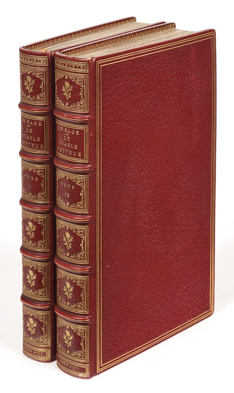 Edition augmentée, illustrée d’un beau frontispice représentant l’apparition du diable et de 12 jolies figures par F. Dubercelle. Notre édition contient pour la première fois deux textes de l’abbé Laurent Bordelon : Les entretiens sérieux et comiques des cheminées de Madrid, et Les béquilles du diable. Les figures sont en second tirage, d’après l’édition de 1726. C’est le premier grand succès de Lesage. Célèbre conte à l’espagnole, sans le rire de «histoires comiques», le canevas est emprunté au Diablo cojuelo de Luis de Guevara auquel l’auteur a payé sa dette dans la préface. Le diable emporte un mortel sur les toits et observe les scènes dans les habitations, prétexte à de nombreuses discussions et satires sur les mœurs des parisiens. Le Diable boiteux est d’abord paru en 1707 mais Lesage en a repris l’ordonnance et en a presque doublé le volume en 1726. L’ouvrage connut un succès ininterrompu jusqu’au XIXe siècle et Favart en fit un bel opéra en 1782. Alain-René Lesage (Sarzeau, 1668-Boulogne, 1747) est resté attaché toute sa vie à la littérature espagnole à laquelle il avait été initié par l’abbé de Lyonne. Avant le Diable boiteux, il traduisit deux pièces de Fernando de Rojas et Lope de Vega, puis le Don Quichotte de Cervantès. Très bel exemplaire dans un maroquin rouge parfaitement exécuté par Lortic fils. A la fois relieur et doreur, Marcellin Lortic (1852-1928) succéda à son père en 1884 et travailla avec un souci constant de l'excellence jusque dans les années 1920. Ex-libris gravés Eugène Vincent (n° 126 ms.) et Denis Chambon, Marseille. Tchemerzine IV, 173. Cohen, 629. Fléty, p. 115.