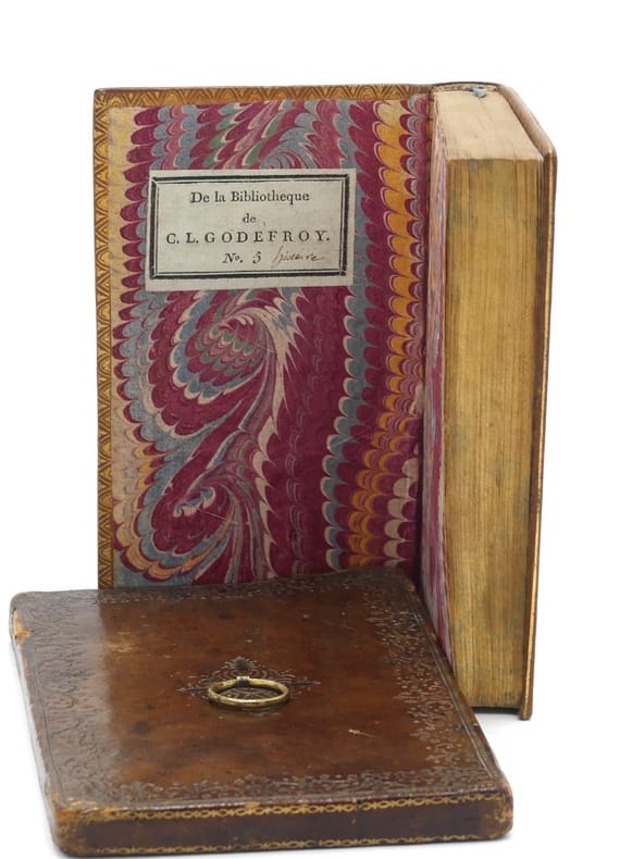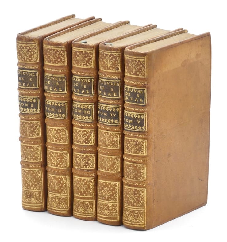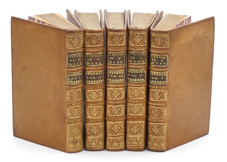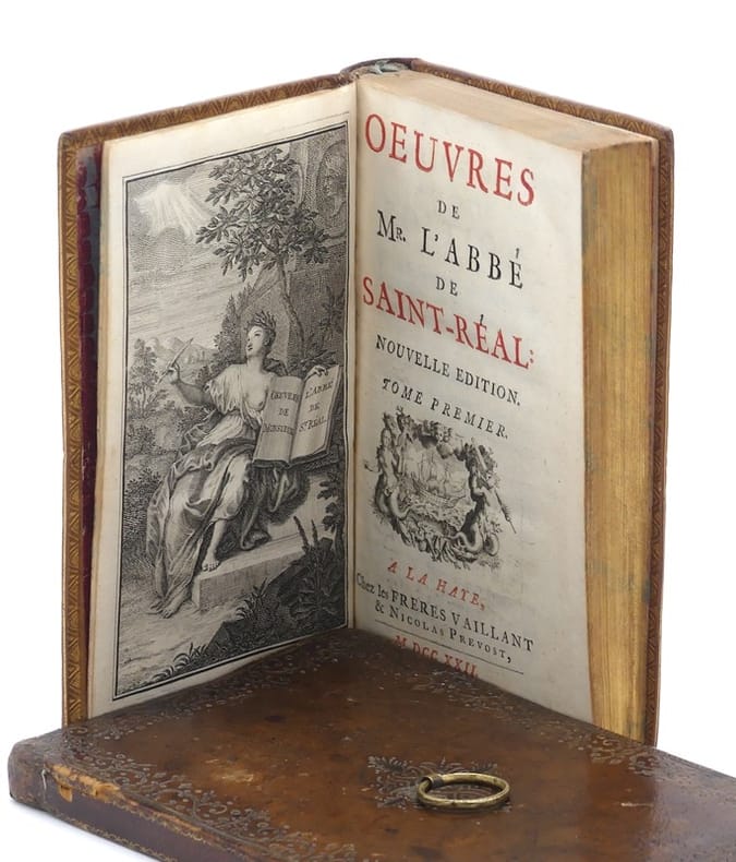L'édition recueillie par Prosper Marchand. Cette édition collective comprend les grandes oeuvres de l'abbé de Saint-Réal : "De l'usage de l'histoire" (1671), "Dom Carlos" (1672, qui inspira Schiller) et "Conjuration des Espagnols contre la République de Venise" (1674). L'édition comprend aussi les nombreux essais de l'auteur sur la théologie, la philosophie, la politique, la littérature et la critique ; des traductions, des maximes, quelques extraits critiques sur l'auteur, ainsi que des ouvrages attribués à Saint-Réal, comme les "Mémoires de madame la duchesse de Mazarin". L'ensemble est précédé d'un avertissement de Prosper Marchand. Cette édition est illustrée de 8 compositions gravées en taille-douce par de Coster. César Vichard, abbé de Saint-Réal (Chambéry, 1639-Chambéry, 1692) est considéré comme l'un des inventeurs du roman historique moderne. Il fut le disciple du Père Ménestrier et de l'historien Antoine Varillas auprès de qui il travailla à la bibliothèque royale et dont il apprit autant la rigueur historique que la souplesse dans la fiction. Dans "De l'usage de l'histoire" (1671), Saint-Réal plaide ainsi pour une connaissance des passions humaines. L'année suivante, il produisit une oeuvre décisive pour le roman moderne, "Dom Carlos". À l'opposé des romans baroques, fleuves, fondés sur un passé mythique, Saint-Réal invente le roman historique, court, centré sur la sphère privée, dans lequel l'amour tient plus de place que la politique. Dom Carlos inspire Madame de Lafayette qui se lance la même année dans la rédaction de La princesse de Clèves. En raison de la force narrative et de la méthode historique dont il faisait preuve, Voltaire le qualifia de "Salluste français" (sénateur et historien romain, ami de César). Dans "Le Rouge et le noir", Stendhal met en exergue du chapitre XIII une citation qu'il attribue à Saint-Réal : "le roman, c'est un miroir que l'on promène le long d'un chemin". Très bel exemplaire en maroquin citron de l'époque. Quérard, La France littéraire, VIII, p. 372.