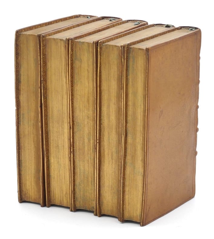 La Haye, Freres Vaillant & Nicolas Prevost, 1722. 5 volumes in-12 (154 x 94 mm), frontispice, titre, 300 pp., 21 pp. n. ch. ; 2 ff. n. ch., 399 pp. ; 2 ff. n. ch., 399 pp. (mal chiffrées 397) ; 2 ff. n. ch., 380 pp. (mal chiffrées 398) ; 4 ff. n. ch., 426 pp., 2 ff. n. ch. Maroquin citron, filet d'encadrement, dos à nerfs orné, pièce de titre et de tomaison en maroquin olive, filet sur les coupes, roulette sur les chasses, tranches dorées sur marbrure, déchirure sans manque sur 2 cm pages 105/106 du tome 1, légère décoloration en haut d'un plat au tome 5 (reliure de l'époque).