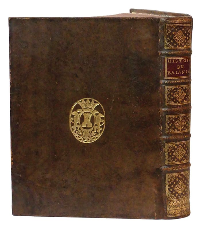 Edition originale, seule parue. Ouvrage de référence sur le baianisme, ainsi nommé d'après l'hérésie de Michel de Bay (1513-1589), théologien de l'Université de Louvain dont plusieurs propositions sur la grâce et le libre-arbitre sont en opposition avec le Concile de Trente et sont condamnées dès 1567 par le pape Pie V. Le jésuite Duchesne, opposant de toujours au jansénisme, s'attaque ici à un corpus qui constitue le socle sur lequel se fondera précisément la doctrine janséniste au début du XVIIe siècle. Duchesne défend le jésuite Leonardus Lessius (1554-1623) et s'emploie, dans les quatrième et cinquième parties, à la condamnation de Jansénius et Saint-Cyran. Le traité est suivi d'Eclaircissements sur l'histoire du baianisme, de nature théologique, et d'un recueil de pièces justificatives. L'ouvrage a été mis à l'index le 11 août 1733 (Bujanda, 2002), peut-être à cause d'attaques contre le dominicain Pierre Soto. Bel exemplaire aux armes de Jean-François Chartraire (1713-1760), marquis de Bourbonne, reprenant le fer de son père. Conseiller au Parlement de Bourgogne, puis président à partir de 1735, il rassembla une riche bibliothèque, continuant la collection de son père, le comte de Consigny, également conseiller au Parlement de Bourgogne et de son beau-père, le président Bouhier. Cette collection passa ensuite à son fils Marc-Antoine, que son gendre, le comte d'Avaux, vendit à l'abbaye de Clairvaux en 1781-82. Guigard, Nouvel armorial du bibliophile, t. II, p. 126-127. O.H.R., pl. 2350. Bujanda (éd.), Index librorum prohibitorum, Médiaspaul-Droz, 2002, p. 304.