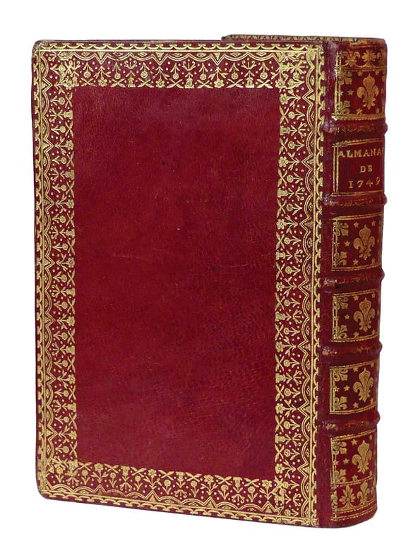 L'annuaire officiel de la Cour au XVIIIesiècle. Cet almanach fut publié de 1700 à 1792 par Laurent d'Houry et ses héritiers successifs. Il fut remplacé par l'Almanach national. "D'une sorte de calendrier qu'il était à l'origine, se contentant d'un "discours général sur les changements de l'air et autres événements de l'année" et de quelques prédictions politiques plus ou moins banales, l'Almanach devint un véritable annuaire officiel, n'ayant plus que faire des "discours" et des "prédictions" (Grand-Carteret). En plus de l'indispensable calendrier, on trouve notamment dans cet ouvrage les dates de naissance et d'alliances, la liste des membres du clergé, des responsables des Maisons royales, des officiers de l'armée, des acteurs de la vie politique (parlementaires, conseillers d'État, fermiers généraux…), des membres des ordres de chevalerie ; la liste des bibliothèques, des membres des Académies, des chirurgiens et pharmaciens royaux, des foires les plus importantes ; les heures de départ des postes pour le courrier et le transport de personnes… L'ouvrage s'achève par une table des matières. Vignette de titre, figures des aspects astrologiques et éclipses gravées sur bois, calendrier interfolié de feuillets vierges. Ex-libris gravé de Charles Gabriel Cottreau (1846-1916), spécialiste d’histoire militaire et collectionneur de livres sur l’Ancien régime. Très bel exemplaire, en maroquin à large dentelle de l'époque. Grand-Carteret,Les Almanachs français, 1600-1895, n°91, p. 26-30.