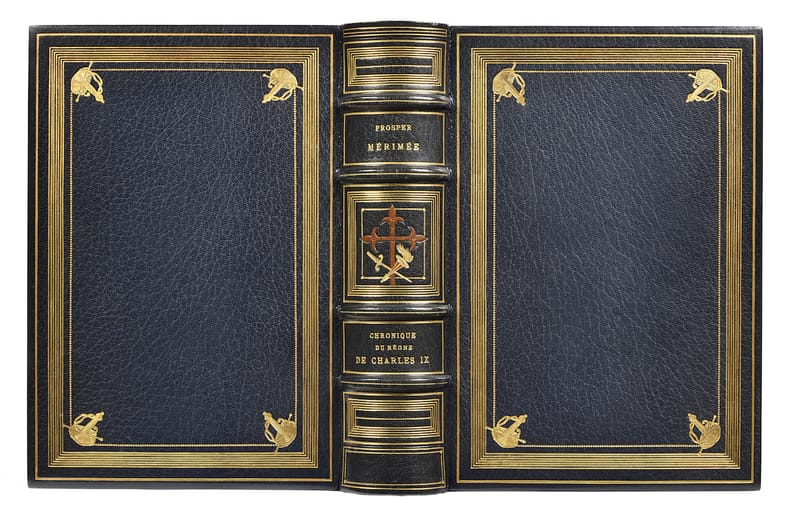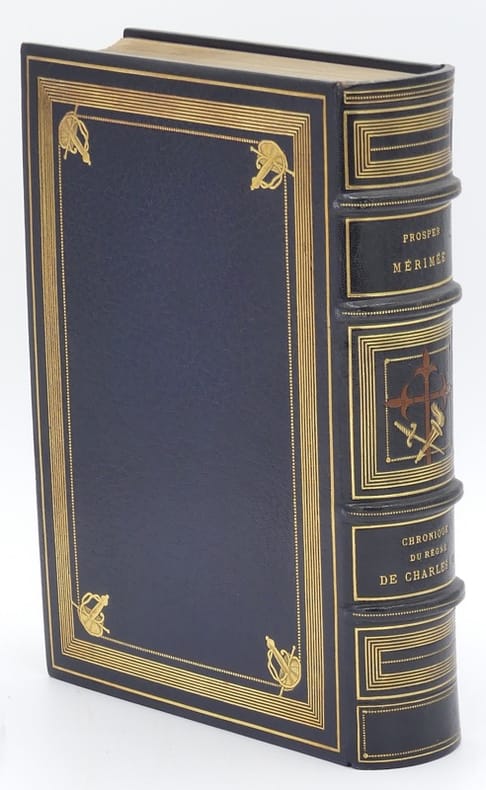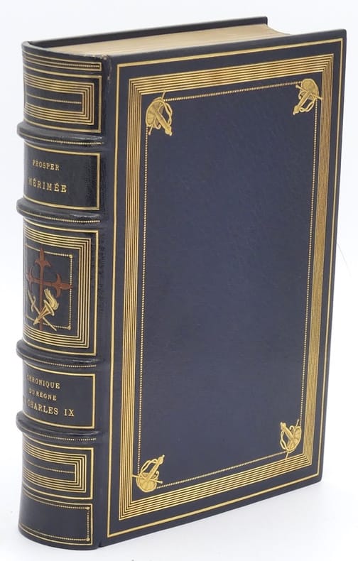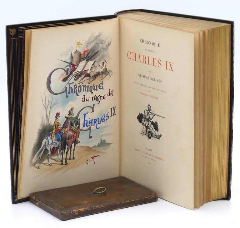 Illustrations de Édouard Toudouze.Paris, Émile Testard et Cie. - 1889 - 322 pages. Nombreuses illustrations dans le texte.Reliure demi-chagrin vert à coins de l'époque. Dos à nerfs. Tête dorée. Couverture conservée, illustrée d'une vignette sur les 2 plats. Rares piqures. Petit frottement en tête du dos. Bon état. Format in-4°(29x20).Prosper Mérimée (1803-1870) possède une écriture qui se caractérise par la rapidité et l'absence de développements qui créent une narration efficace et un réalisme fonctionnel adaptés au genre de la nouvelle. "Chronique du règne de Charles IX" en 1829 est son seul roman.