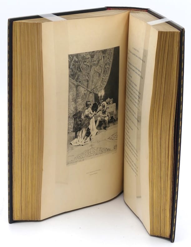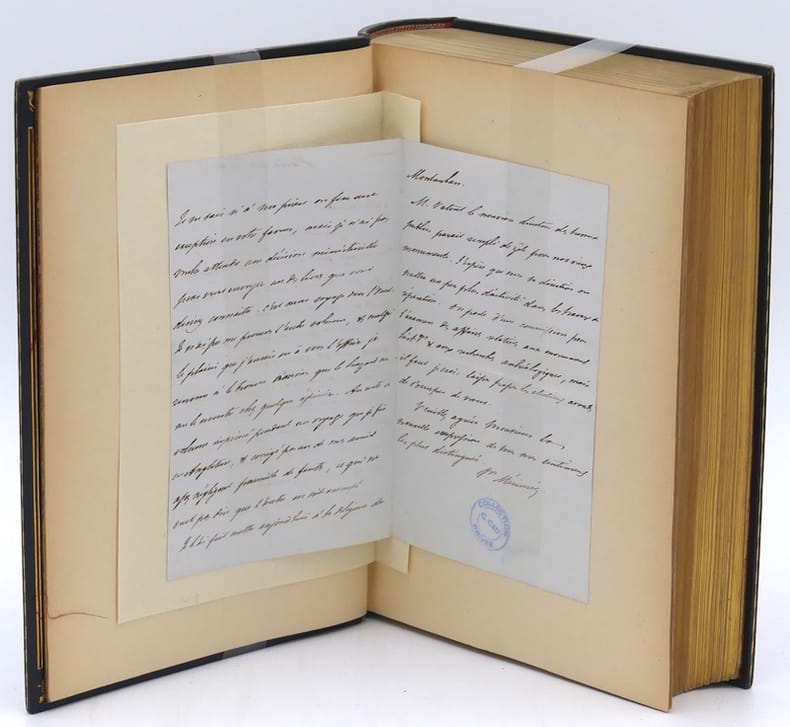 Édition ornée de 110 compositions par Édouard Toudouze, gravées sur bois par Léveillé. Tirage à 1100 exemplaire dont 100 en grands papiers, celui-ci un des 75 Japon comprenant un tirage à part de toutes les illustrations. Remarquable exemplaire enrichi de plusieurs documents, dont une lettre autographe signée de Mérimée au sujet de l’envoi de ses livres, dont les Notes d’un voyage dans l’Ouest de la France, à un correspondant de Montauban (2 pp. sur un bi-feuillet de papier bleu, datées du 10 septembre). Cet exemplaire renferme aussi une grande aquarelle originale de Henri de Sta, formant un second titre et montée en frontispice, ainsi qu’une suite de 8 compositions de Toudouze gravées à l’eau-forte par Eugène Abot, avec une nouvelle préface de Francisque Sarcey. Cette suite, tirée à 100 exemplaires en 1890, se joignait à l’édition. Il s’agit ici de l’un des 50 tirages sur Japon avec les eaux-fortes en 4 états réparties dans le texte. De la bibliothèque de Frédéric Raisin (1851-1923), avocat et bibliophile genevois, avec son bel ex-libris gravé à l’eau-forte par Van Muyden. Passionné de littérature, il traduisit l’œuvre du poète argentin Leopoldo Diaz et composa lui-même des poésies satiriques. Sa bibliothèque fut dispersée à Paris en décembre 1901. Ex-libris moderne de Giorgio Mirandola, professeur de littérature française à l’université de Bergame. Très bel exemplaire en maroquin décoré de Charles Meunier. Carteret, Le Trésor du bibliophile, livres illustrés modernes 1875-1945, IV, p. 278: «Intéressante publication, cotée en grand papier».