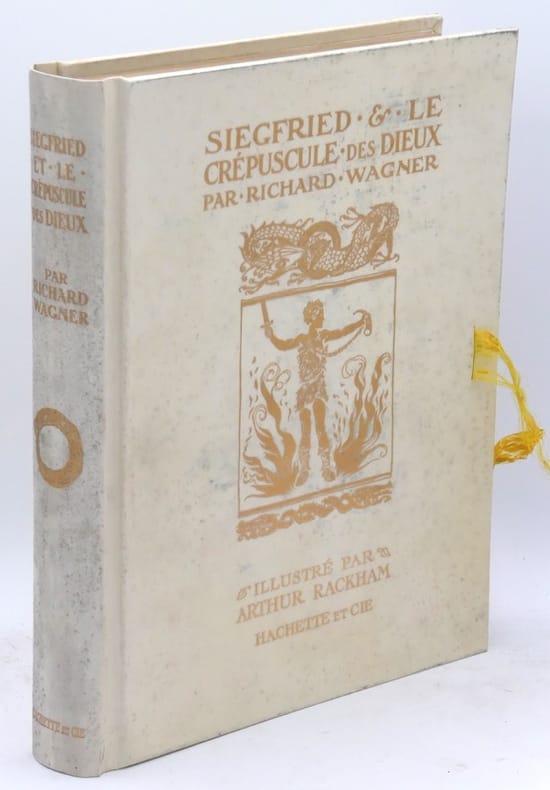 L'ANNEAU DU NIBELUNG | Tetralogie par Richard Wagner. L'Or du Rhin | La Walkyrie | Siegfried | Le Crépuscule des Dieux. Premier volume : L'Or du Rhin et la Valkyrie, par Richard Wagner, avec illustrations par Arthur Rackham. Traduits en prose rythmée par Alfred Ernst. Paris, Hachette et Cie (imprimerie Ballantyne and Company Ltd, Londres), sans date (1910) X-158-(2) pages et 34 compositions en couleurs contrecollées sur papier marron. 4 hors-textes contrecollés présentes de petites traces de pli (sans gravité). Quelques feuillets avec légère décharge (acidité du papier marron sur lequel sont montés les hors-texte). Beau papier vélin de cuve. Tirage numéroté à 330 exemplaires dont 30 exemplaires sur Japon signés par l'artiste et 300 exemplaires sur papier vélin à la forme. Celui-ci, un des 300 exemplaires sur papier vélin à la forme et numéroté au composteur (n°245). Reliure éditeur plein vélin décoré doré. Reliure très fraîche. Rubans absents. Deuxième volume : Siegfried et Le Crépuscule des Dieux, par Richard Wagner, avec illustrations par Arthur Rackham. Traduits en prose rythmée par Alfred Ernst. Paris, Hachette et Cie (imprimerie Ballantyne and Co Limited, Londres), sans date (1911) (8)-185-(2) pages et 30 compositions en couleurs contrecollées sur papier marron. Parfait état intérieur. Tirage numéroté à 390 exemplaires dont 40 exemplaires sur Japon signés par l'artiste et 350 exemplaires sur papier vélin à la forme. Celui-ci, un des 40 exemplaires sur Japon signés et numéroté (n°24) à la plume par Arthur Rackham.