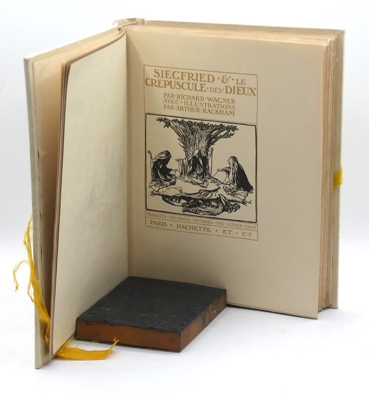 Edition illustrée par Arthur Rackham de la seconde et dernière partie de la Tétralogie comprenant La Walkyrie, Siegfried et le Crépuscule des dieux, précédées d’un prologue, L’Or du Rhin, le tout intitulé L’Anneau du Nibelung.La traduction, en prose rythmée, est celle d'Alfred Ernst (Périgueux, 1860–Paris, 1898).Cette édition de luxe fut tirée à 390 exemplaires. Celui-ci est un des 40 exemplaires de tête sur Japon signés à la main par l'artiste.Elle contient 30 planches en couleurs hors-texte, contrecollées sur vélin brun, sous serpentes légendées en bistre, et des illustrations en noir en en-têtes et culs-de-lampe.La légende des Nibelungen.Séduit par l’épopée patriotique et la puissance mythologique de la légende des Nibelungen, Richard Wagner publia, en 1848, "un essai "Le Mythe des Nibelungen, considéré comme esquisse d'un drame", interprétation à la fois sociale et historique, mais qui contient déjà l'essentiel de "l'Anneau du Nibelung" et il écrit le texte de "La Mort de Siegfried", qui correspond au "Crépuscule des dieux". Ainsi donc, en ce qui concerne le livret, R. Wagner commence la Tétralogie par la fin" (Les Sources littéraires de Wagner dans l’élaboration de l’Anneau de Nibelung). "Le langage des sons est le commencement et la fin de celui des mots, comme le sentiment est le commencement et la fin de l’entendement, le mythe, le commencement et la fin de l’histoire, le lyrisme le commencement et la fin de la poésie" (Richard Wagner, Opéra et Drame, 1851, traduit de l’allemand par J.-G. Prod’homme, 1913, deuxième partie, chapitre VI).Arthur Rackham, maître de la féérie. Formé à l’école d’art de Lambert, Arthur Rackham (Londres, 1867-Limpsfield, 1939) exposa des aquarelles à la Royal Academy dès 1888 tout en gagnant sa vie dans la presse illustrée. C’est au tournant du siècle que sa carrière fit un bond en avant, grâce notamment à ses cinquante-et-une planches en couleurs pour "Rip Van Winkle" (1905) qui lui apportèrent une véritable reconnaissance. Son univers empreint de fantaisie regorge de créatures étranges, de forêts brumeuses peuplées de gnomes, d’elfes et de dragons. "Le fantastique s’épanouit avec Rackham. Depuis un siècle, ses illustrations charment et impressionnent par leur grâce, leur étrangeté non dépourvue d’humour, leur fascinante beauté. Illustrateur de la féerie par excellence, il a fait des légendes et récits merveilleux un domaine de prédilection où exercer son art du crayon et du pinceau" (catalogue de l’exposition "Il était une fois… les contes de fées").Si son inspiration le porta naturellement vers la littérature de jeunesse – il illustra les Contes de Perrault, Peter Pan, Alice au pays des merveilles, etc. – Arthur Rackham se fit également remarquer pour ses illustrations du Songe d’une nuit d’été de Shakespeare (1908) ou de l’Ondine de La Motte-Fouqué (1911). Très bel exemplaire en reliure de luxe de l'éditeur.Carteret, IV-407. Monod, 11464. Les sources littéraires de Wagner dans l’élaboration de l’Anneau de Nibelung, Uliège 1980. Osterwalder, Dictionnaire des illustrateurs 1800-1914, 857-858. Il était une fois… les contes de fées, exposition du 20 mars au 17 juin 2001, Bibliothèque nationale de France, 2001.