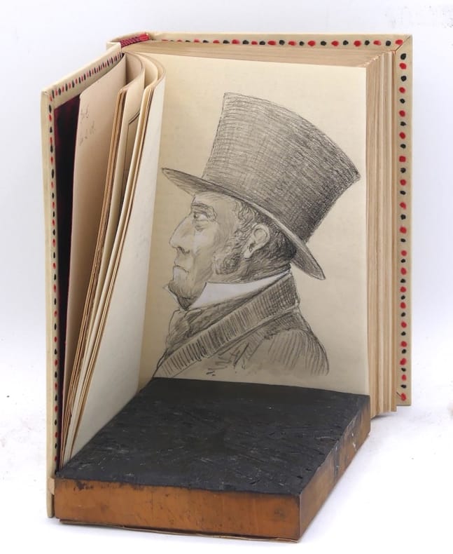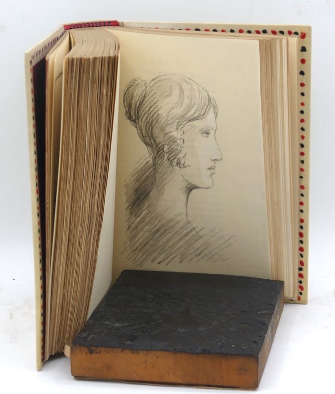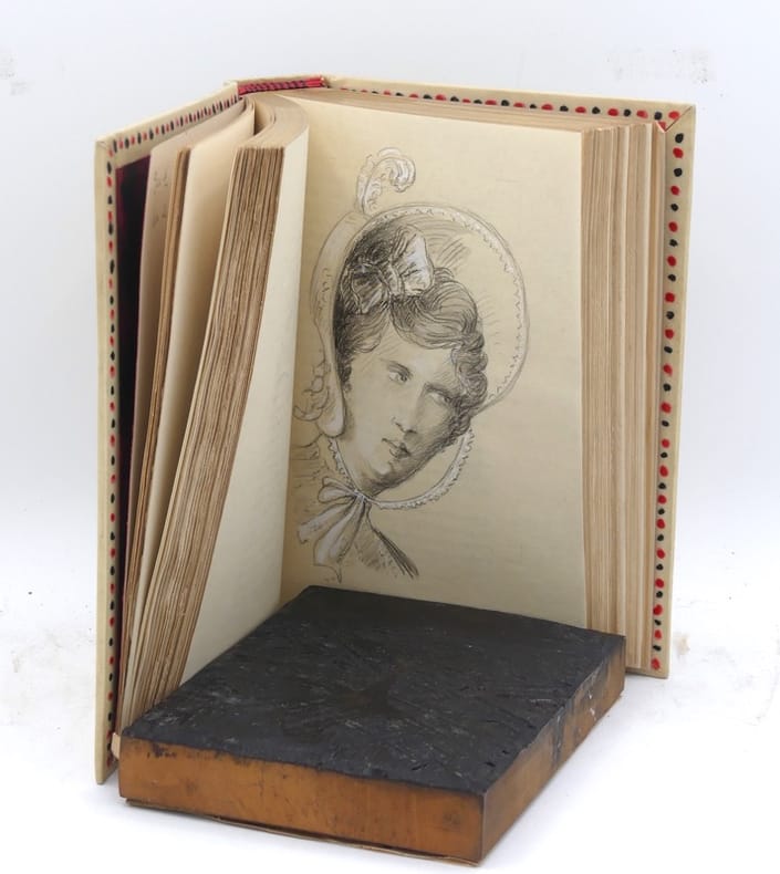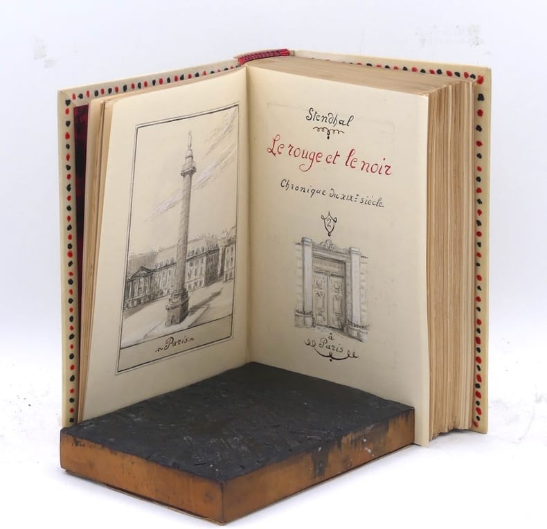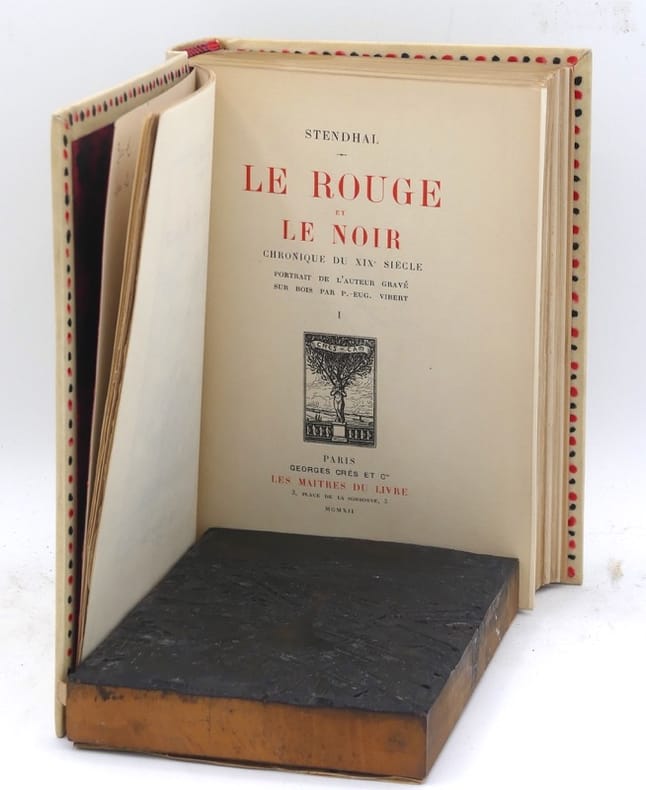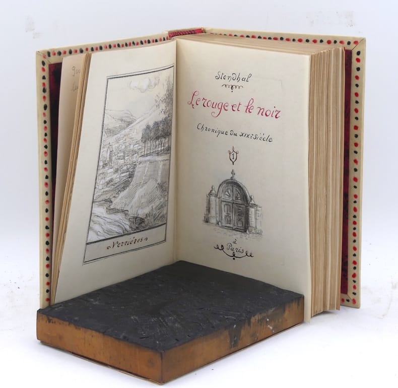 Ce dixième livre de la collection des "Maitres du livre" est illustré en frontispice d'un portrait de l'auteur gravé sur bois et d'ornements dans le texte par Pierre-Eugène Vibert. Il a été tiré à 1113 exemplaires. Celui-ci est un des 1050 sur papier des manufactures de Rives. Exemplaire unique, décoré par André-Jean Powilewicz pour sa collection personnelle. Cet exemplaire est enrichi de deux titres avec vignette à la mine de plomb et lavis, de deux frontispices, d'une dédicace à Henri Beyle, de 8 portraits hors-texte à la mine de plomb et lavis d'André-Jean Powilewicz accompagnés d'un feuillet portant le nom du personnage calligraphié à l'encre brune entouré d'arabesques en noir et de deux tables manuscrites des illustrations portant chacune deux illustrations. Il a également réalisé le décor de la reliure. À la fin du volume se trouvent un feuillet de justification, portant la mention "Ce livre Le Rouge et le noir de Stendhal a été illustré par A. J. Powilewicz durant l'année : MCMXLVII", et 2 dessins préparatoires pour la reliure. Fils d’un docteur en médecine, André-Jean Powilewicz (Le Havre, 1886-Paris, 1969) fut lui-même médecin, écrivain et dessinateur. Il a publié chez Henri Jonquières un recueil intitulé "Gloire triste, récits suivis d’un essai sur l’ennui" (1929), orné de ses propres lithographies, et illustré plusieurs ouvrages de Charles Foix chez le même éditeur. Bibliophile et amateur "touche-à-tout", il reliait et illustrait lui-même les ouvrages de sa collection. Charmant exemplaire unique.