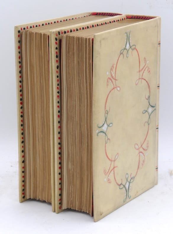 Paris Georges Crès et Cie 1912 Deux volumes in-12 (187 x 128 mm), 2 ff. n. ch., 412 pp., 1 f. n. ch.; 2 ff. n. ch., 436 pp., 1 f. n. ch. Vélin à la bradel, plats décorés d'arabesques en vert, blanc et rouge, dos lisse orné de faux filets en rouge et noir, auteur, titre, tomaison et date calligraphiés en rouge et noir, tête dorée, non rogné, couvertures et dos conservés (reliure du temps).