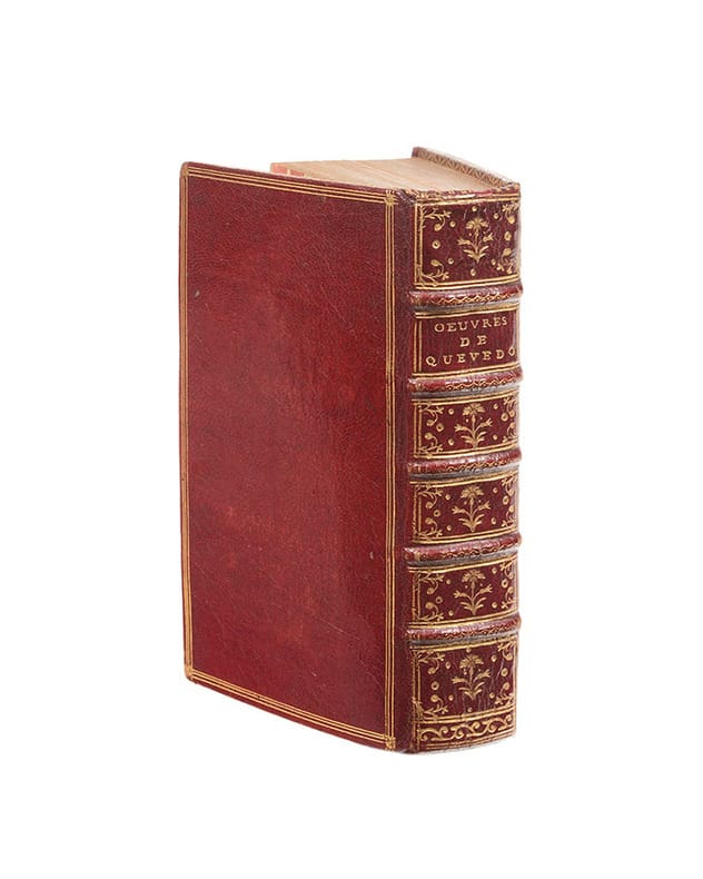 Très belle édition illustrée d’un spectaculaire frontispice. La Geneste, dont la traduction avait d’abord paru en 1632-33, est le premier traducteur et le seul à donner les deux chefs-d’oeuvre de Quevedo. Francesco Quevedo (Madrid 1580-Province de Ciudad Real 1645) est l’un des plus grands écrivains espagnols, il brilla dans les genres les plus variés. Secrétaire d’État, agent secret, ambassadeur, son génie satirique lui valut de nombreux ennemis et plusieurs séjours en prison. Le Buscon a établi les canons de l’histoire picaresque. Les Visions, moins connues aujourd’hui, ont été lues avidement par les contemporains, dont Cyrano de Bergerac, passant rapidement pour une œuvre française, ainsi dans laBibliothèque française de Charles Sorel. Les Œuvres contiennent par ailleurs une version française du Don Diego de la Noche de Salas Barbadillo sous le titre Le Coureur de nuit dans la veine picaresque. La Geneste a su rendre la virulente charge morale, sociale, politique, de son modèle, censuré en Espagne. Plusieurs critiques ont proposé de voir l’œuvre du jeune Scarron derrière le prête-nom de La Geneste se fondant notamment sur des études de vocabulaire (voir Phelouzat). «Un monument intéressant de la prose française à l’orée du classicisme» (G.-A. Pérouse). Parfait exemplaire en maroquin du XVIIIe siècle. Palau y Dulcet, Manual del librero hispanoameriano, XIV, n°243706; José Manuel Losada Goya, Bibliographie critique de la littérature espagnole en France au XVIIe siècle, n°334. Brunet, IV, 1017 ne cite que des rééditions. Arbour, L’Ere baroque en France, troisième partie, n°15324 (pour l’édition de 1634). C. Phelouzat, La Geneste traducteur de Francisco de Quevedo, thèse, 1973. G.-A. Pérouse, Réforme, Humanisme, Renaissance, 2005, p. 213.