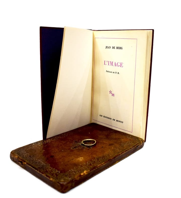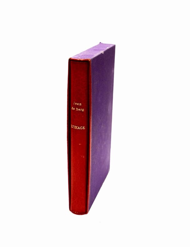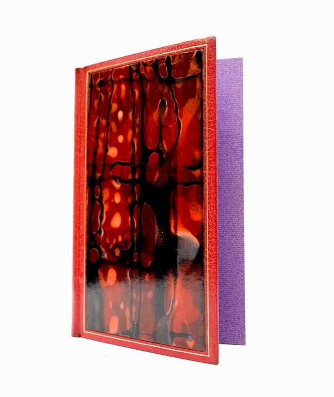 Paris, Minuit, 1969. In-12 (183 x 115 mm), 183 pp., 4 ff. n. ch. Maroquin rouge, plats ornés d’un large rectangle de papier glacé aux motifs rouges et noirs, filet doré en encadrement, dos lisse avec auteur et titre en doré, étui cartonné violet bordé de maroquin rouge, couvertures et dos conservés, petite tache sur la deuxième couverture (G. Robinson).
