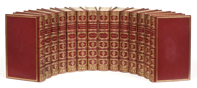 Belle édition latine des œuvres complètes imprimée par les Barbou et établie par le philologue Jean-Nicolas Lallemand. Elle est ornée d’un beau portrait-frontispice gravé sur cuivre par Cathelin d’après Rubens. «Un bon texte, des notes rédigées avec une habile concision, et de plus une impression soignée, ont assuré le succès de cette édition" (Brunet). Il est vraisemblable que Lallemand ait suivi le texte établi par l’abbé d’Olivet dans son édition de 1740-42 (voir Schweiger et Graesse), tout en utilisant de nouveaux manuscrits pour apporter des corrections dans certaines œuvres. Le tome I contient également, imprimée en caractères de corps plus réduit, la Rhétorique à Herennius, désattribuée à Cicéron depuis Renaissance et rendue à un certain Cornificius. Exceptionnel exemplaire sur papier fin d'Annonay dans une parfaite reliure de Cuzin. Ces exemplaires sont mentionnés par Brunet: «il y a des exemplaires sur papier finqui sont un plus chers ». Francisque Cuzin (1836-1890), s'établit à Paris en 1861. Il pratiqua rapidement la reliure très soignée qui fit sa renommée. Cuzin reçut un des prix de l'exposition universelle de 1889 dont le rapport disait notamment :Toutes les reliures exposées par F. Cuzin sont des joyaux admirables. Le corps d'ouvrage est parfait dans tous les détails et ne prête matière à aucune critique. Le bon choix des maroquins, le talent avec lequel ils sont travaillés, la dorure correcte, toutes ces qualités, en un mot, nous autorisent à comparer les reliures de M. Cuzin aux œuvres signées par l'inoubliable et regretté maître Trautz qu'il semble avoir pris pour modèle. Il excelle à reproduire d'une manière parfaite les chefs-d'œuvre anciens et ne réussit pas moins dans l'exécution des reliures modernes... Très bel exemplaire en maroquin rouge parfaitement établi par Cuzin. Brunet, II, 12. Graesse, Trésor de livres rares et précieux, II, 158. Schweiger, Handbuch der classischenBibliographie, I, p.108. Fléty, p. 50-51.